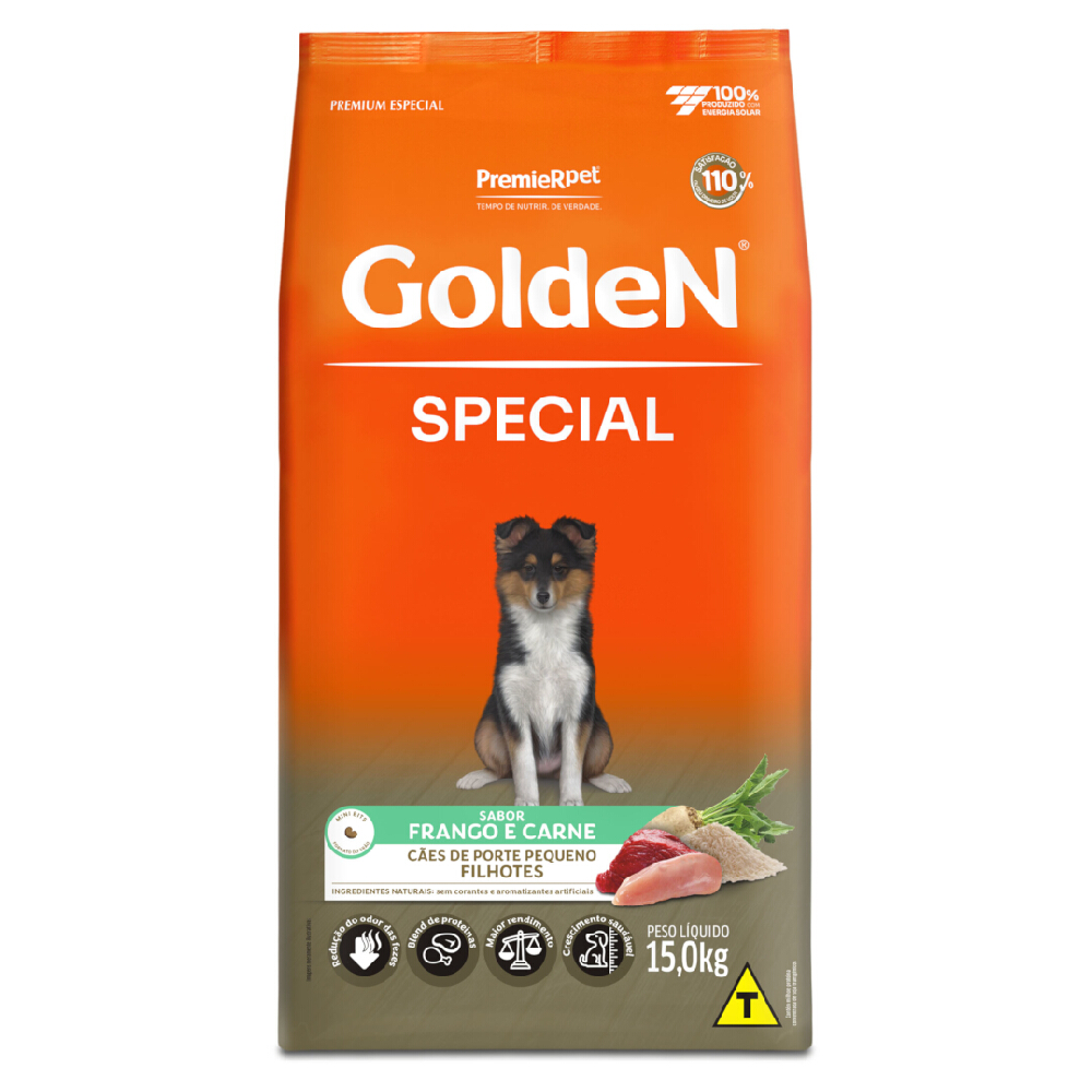 Golden Special Filhotes Porte Pequeno Sabor Frango e Carne: Alimento completo e nutritivo para oferecer ao seu filhote de porte pequeno o melhor começo de vida, proporcionando-lhe saúde, vitalidade, desenvolvimento e alegria para que ele se torne um cão adulto forte, feliz e cheio de energia.