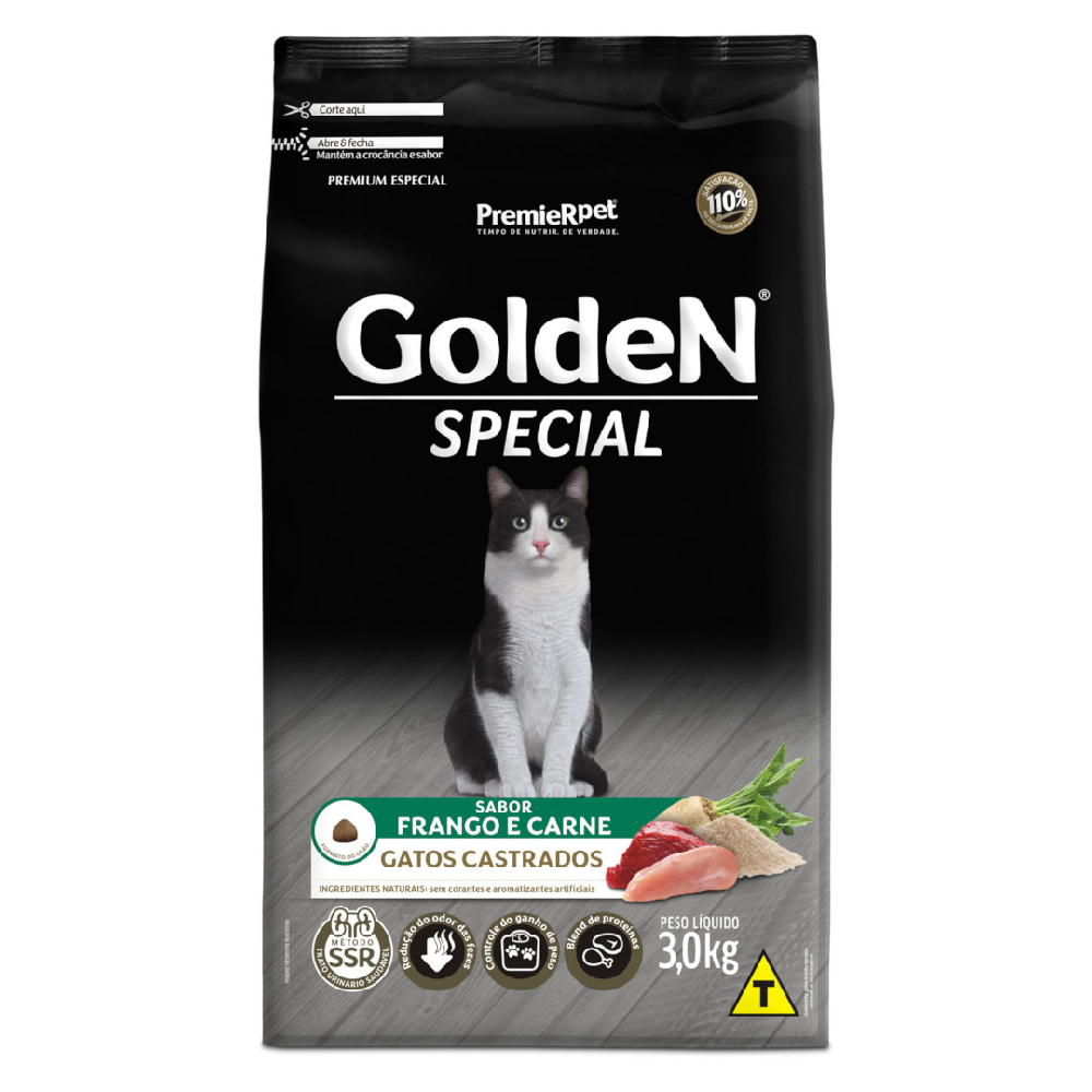Golden Special Gatos Adultos Castrados Frango e Carne 3KG: Alimento completo e nutritivo para oferecer ao seu gato castrado o melhor da vida, proporcionando-lhe saúde, vitalidade, bem-estar e felicidade para que ele viva uma vida longa e plena ao seu lado.