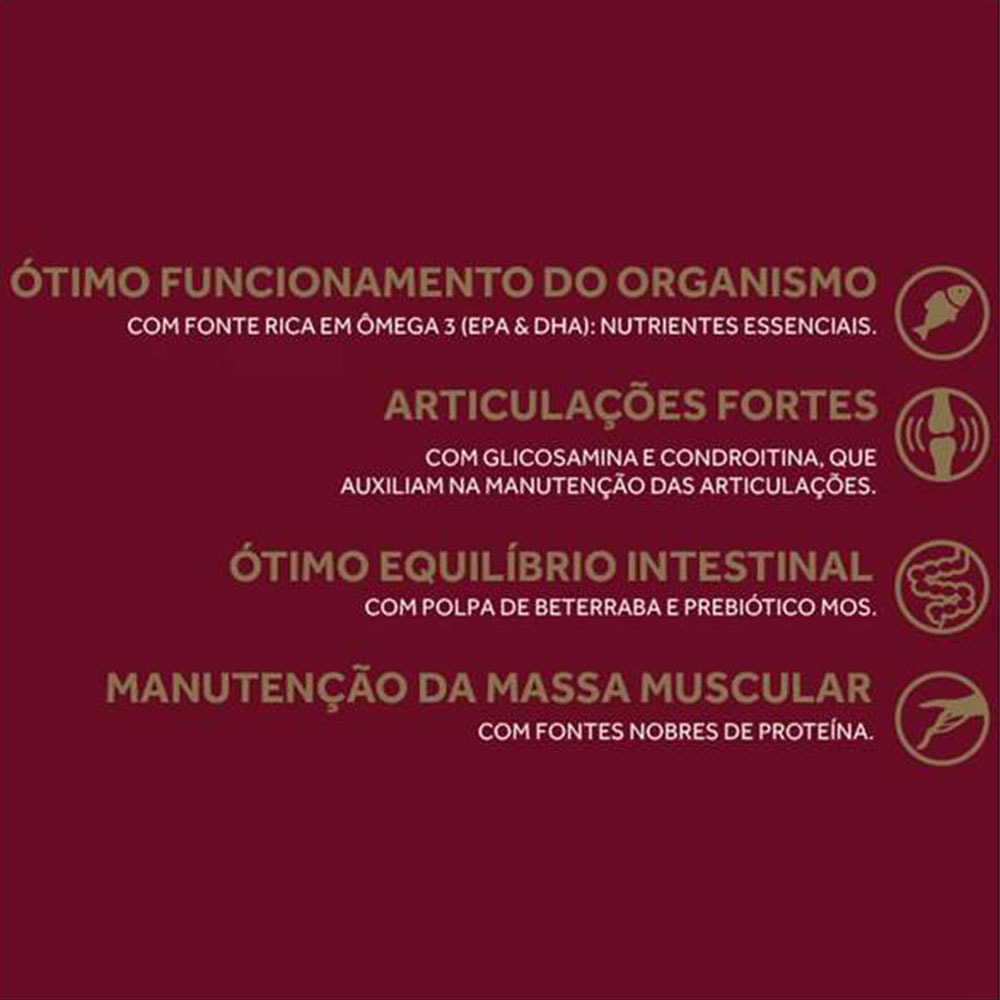 Farinha de Vísceras de Aves (mín. 20%), Farelo de Glúten de Milho-60, Quirera de Arroz, Milho Integral Moído, Sorgo Integral Moído, Gordura Animal Estabilizada, Óleo de Peixe Refinado, Óleo de Linhaça (mín. 0,1%), Polpa de Beterraba (mín. 0,2%), Farelo de Trigo, Levedura Seca de Cervejaria, Sulfato de Glicosamina (mín. 0,01%), Sulfato de Condroitina (mín. 0,005%), Cloreto de Sódio (Sal Comum), Cloreto de Potássio, Hidrolisado de Fígado Ave e Suíno, Aditivo Prebiótico (Parede Celular de Levedura - Fonte de Mananoligossacarídeos, mín. 0,1%), Antioxidantes (BHA, BHT), Ácido Propiônico, Sorbato de Potássio, Aditivo Adsorvente, Vitaminas (A, D3, E, K3, C, B1, B2, B6, B12, Ácido Pantotênico, Ácido Fólico, Niacina, Biotina, Cloreto de Colina), Minerais (Sulfato de Zinco, Sulfato de Ferro, Sulfato de Manganês, Iodato de Cálcio, Selenito de Sódio), Minerais Quelatados (Proteinato de Manganês, Levedura Enriquecida com Selênio, Proteinato de Zinco, Proteinato de Cobre).
