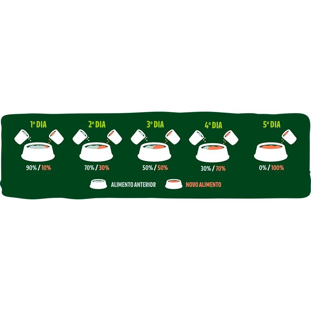 Seleção de Ingredientes de Origem Animal, mín. 50% (dos quais mín. 16% são Carnes Selecionadas: Carne Mecanicamente Separada de Frango e Fígado de Frango; Farinha de Vísceras de Aves, Farinha de Torresmo, Ovo em Pó, Óleo de Vísceras de Aves, Gordura Suína, Óleo de Peixe Refinado, Hidrolisado de Fígado Ave e Suíno). Seleção de Cereais Integrais, mín. 40% (Arroz Integral, Grão de Aveia, Cevada em Grão, Grão de Sorgo). Seleção de Vegetais, Frutas, Vitaminas, Minerais e Ingredientes Funcionais, máx. 10% (dos quais máx. 5% são Vegetais e Frutas Selecionados: Ervilha, Brócolis Desidratado, Espinafre Desidratado, Cenoura Desidratada, Mirtilo Desidratado Blueberry, Amora Desidratada, Maçã Desidratada, Manga Desidratada, Polpa de Beterraba, Farinha da Alga Schizochytrium sp., Semente de Psyllium, Casca de Aveia Moída, Levedura Seca de Cervejaria, Óleo de Linhaça; Cloreto de Potássio, Carbonato de Cálcio, Sulfato de Condroitina, Sulfato de Glicosamina, Parede Celular de Levedura Fonte de Beta-Glucanos, Hexametafosfato de Sódio, Extrato de Yucca, L-Lisina, Taurina, DL-Metionina, L-Carnitina, Propionato de Cálcio, Sorbato de Potássio, Aditivos Prebióticos: Inulina e Parede Celular de Levedura Fonte de Mananoligossacarídeos; Antioxidantes Naturais: Extrato de Alecrim e Concentrado de Tocoferóis; Aditivo Adsorvente: Parede Celular de Levedura e Bentonita; Vitaminas: A, D3, E, K3, C, B1, B2, B6, B12, Pantotenato de Cálcio, Ácido Fólico, Ácido Nicotínico, Biotina, Cloreto de Colina; Minerais: Sulfato de Zinco, Sulfato de Ferro, Sulfato de Manganês, Iodato de Cálcio; Minerais Quelatados: Proteinato de Manganês, Levedura Enriquecida com Selênio, Proteinato de Zinco, Proteinato de Cobre).Níveis de Garantia (por quilograma)