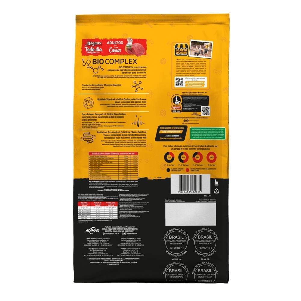 A Ração Magnus Premium Todo Dia Cães Adultos Sabor Carne é um alimento premium completo seco, formulado com precisão para atender as exigências do cão adulto, acima de 12 meses, de qualquer raça, em fase de manutenção. Nutritivo e saboroso, agrada ao paladar do cão, provendo benefícios a sua vida.