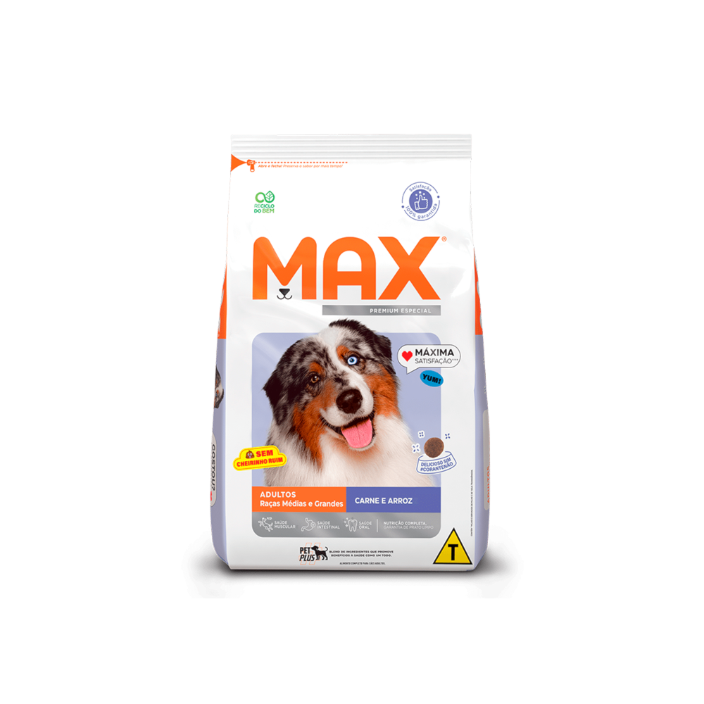 Descrição do produto Com Max Cães Adultos Raças Médias e Grandes Carne e Arroz é fácil cuidar do seu filho de quatro patas, para ele viver saudável e feliz. Toda linha conta com o selo #PetPlus, um blend de ingredientes que promove benefícios à saúde como um todo, fortalecendo as defesas naturais do organismo, auxiliando a saúde intestinal e colaborando para uma pelagem #WOW, sedosa e brilhante. Com Max, o cuidado do seu peludo está em ótimas mãos.