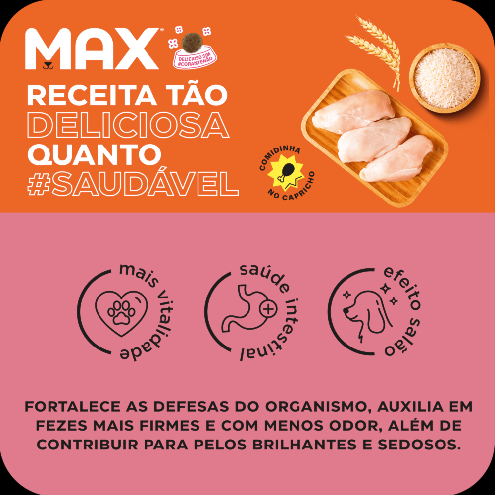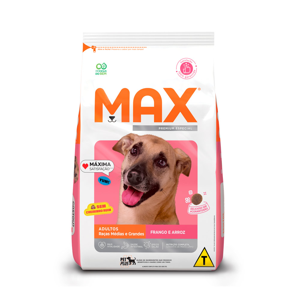 Descrição do produto Com Max Cães Adultos Raças Médias e Grandes Frango e Arroz é fácil cuidar do seu filho de quatro patas, para ele viver saudável e feliz. Toda linha conta com o selo #PetPlus, um blend de ingredientes que promove benefícios à saúde como um todo, fortalecendo as defesas naturais do organismo, auxiliando a saúde intestinal e colaborando para uma pelagem #WOW, sedosa e brilhante. Com Max, o cuidado do seu peludo está em ótimas mãos.