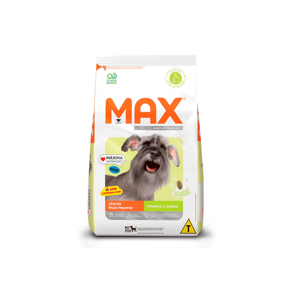 Max Cães Senior Raças Pequenas Frango e Arroz foi cuidadosamente elaborado para cães idosos com mais de 7 anos de idade, ficando fácil cuidar do seu filho de quatro patas, para ele viver saudável e feliz. Toda linha conta com o selo #PetPlus, um blend de ingredientes que promove benefícios à saúde como um todo, fortalecendo as defesas naturais do organismo, auxiliando a saúde intestinal e colaborando para uma pelagem #WOW, sedosa e brilhante. Além disso, sua formulação contribui para redução do estresse nas articulações e auxilia no combate ao envelhecimento. Com Max, o cuidado do seu peludo está em ótimas mãos.