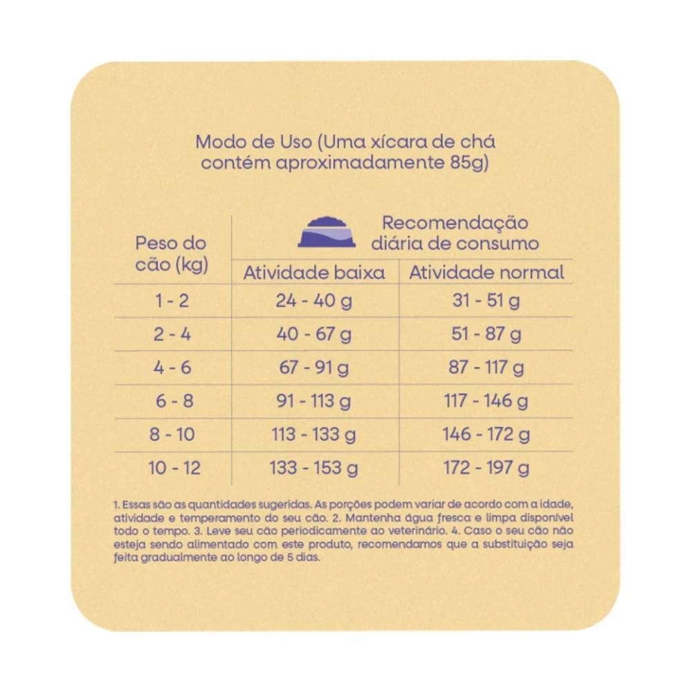 | Composição | Farinha de carne de aves (peru) (1%), farinha de vísceras de aves (10%), óleo de aves, óleo de peixes, grão de milho**, gérmen de milho desengordurado**, farelo de glúten de milho**, grão de sorgo, quirera de arroz, aveia laminada (0,2%), grão de linhaça (0,5%), farelo de soja*, espinafre desidratado (0,02%), cenoura (0,02%), polpa desidratada de beterraba, mamão (1%), maçã (1%), fosfato bicálcico, cloreto de sódio, hidrolisado de fígado desidratado de aves, hidrolisado de fígado de aves, tocoferol (concentrado), extrato de alecrim, propionato de cálcio (0,18%), cloreto de potássio, levedura seca de cervejaria, aditivo prebiótico (0,3%), extrato de yucca (0,025%), cloreto de colina, retinol, cianocobalamina, colecalciferol, tocoferol, ácido ascórbico, ácido fólico, ácido pantotênico, tiamina, riboflavina, piridoxina, biotina, menadiona bissulfito de nicotinamida, niacina (ácido nicotínico), complexo ferro aminoácido, complexo cobre aminoácido, complexo manganês aminoácido, complexo zinco aminoácido, proteinato de selênio e iodato de cálcio. | ||||||||||||||||||||||||||||||||||||||||