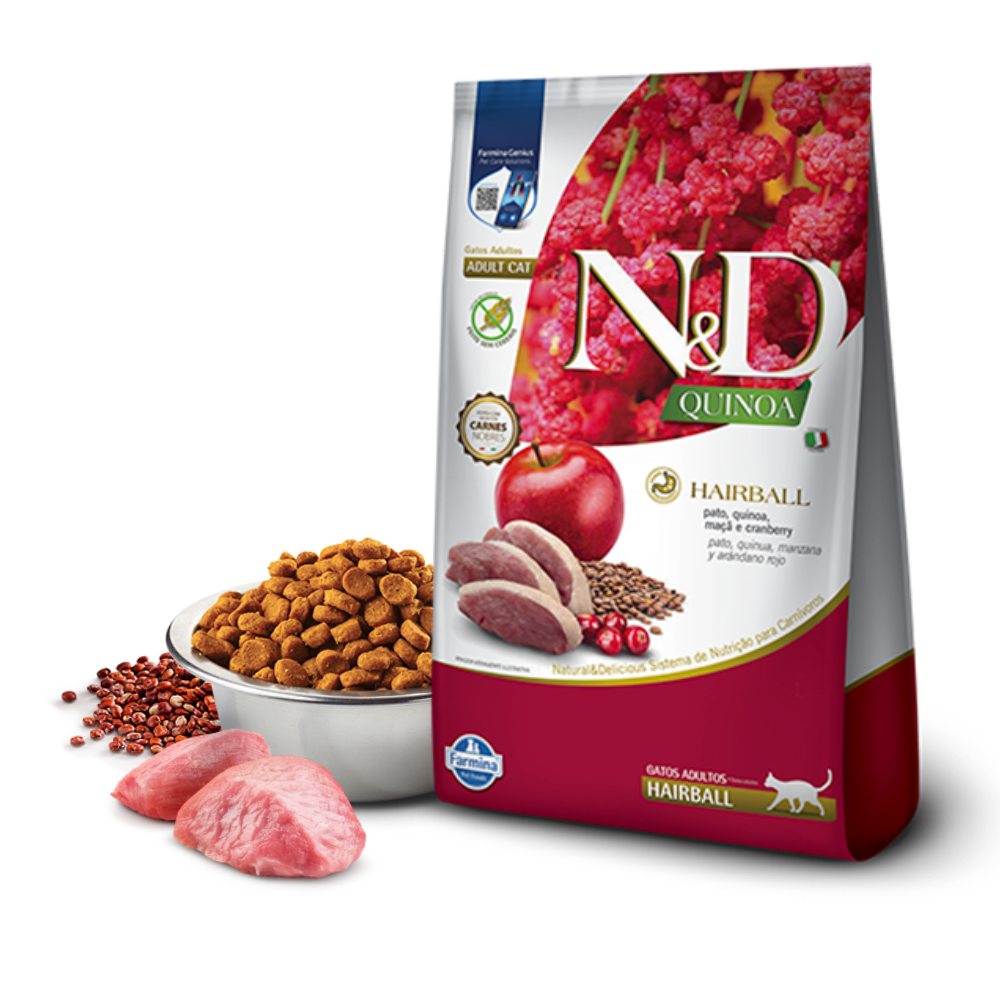 Nossa ração ND Quinoa Hairball contém ingredientes naturais como pato, maçã e cranberry, proporcionando uma experiência sensorial única e deliciosa para o seu gato.