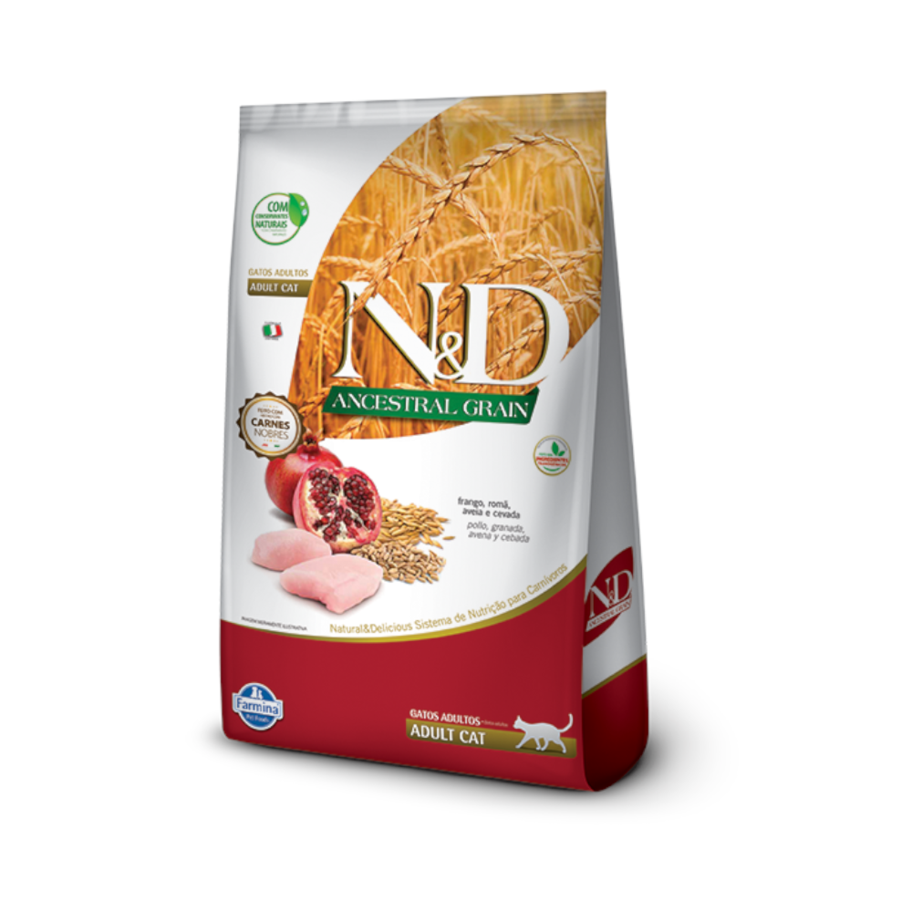 A Ração Farmina N&D Ancestral Grain Frango Gatos Adultos é um alimento de origem Italiana, com baixo índice glicêmico, possui apenas cereais ancestrais em pequena quantidade, que resulta em um produto com nível de amido reduzido, por isso promove menor oscilação da resposta glicêmica. Conservado naturalmente, utilização da Vitamina E (concentrado de tocoferóis) como conservante natural, livre de BHA e BHT. Possui 90% de ingredientes de origem animal e livre de transgênico.