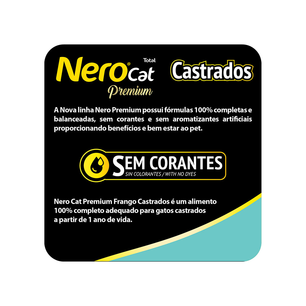 A ração Nero para Gatos Castrados é formulada com ingredientes de alta qualidade, como frango, grãos selecionados, e uma variedade de vitaminas e minerais. A fórmula é livre de corantes artificiais e contém antioxidantes naturais para garantir a frescura e o sabor.