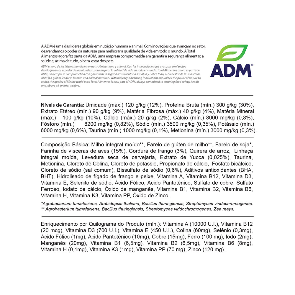 Farinha de vísceras de aves (15%), óleo de aves, grão de milho**, farelo de glúten de milho**, quirera de arroz, farelo de soja*, grão de linhaça, fosfato bicálcico, cloreto de sódio, cloreto de potássio, propionato de cálcio, bissulfato de sódio, extrato de yucca (0,025%), levedura seca de cervejaria, metionina, taurina, hidrolisado de fígado de frango e peixe, pantotenato de cálcio, retinol, tiamina, cianocobalamina, riboflavina, piridoxina, colecalciferol, biotina, bissulfito de menadiona nicotinamida, ácido nicotínico, ácido fólico, tocoferol, sulfato de cobre, sulfato de ferro, monóxido de manganês, selenito de sódio, óxido de zinco, iodato de cálcio.