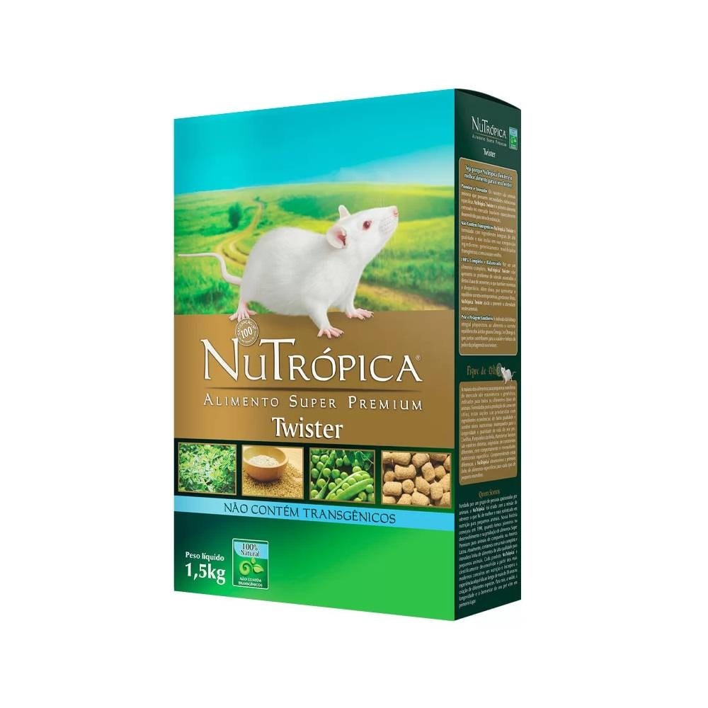 NuTrópica® Twister é um alimento extrusado completo, cientificamente formulado e especialmente desenvolvido para ratos de estimação (twisters). Cada embalagem de NuTrópica® Twister contém uma combinação exclusiva das mais nobres e saborosas matérias-primas não transgênicas, preparadas sob rigoroso controle de qualidade e utiliza as melhores técnicas em produção de alimentos. Sua fórmula exclusiva inclui uma grande variedade de grãos integrais (aveia, trigo, ervilha, girassol e linhaça), proteínas animais de alta qualidade e alfafa, que juntos proporcionam os níveis ideais dos nutrientes necessários para a perfeita saúde, bem-estar e longevidade do seu twister. Por ser um alimento não transgênico, NuTrópica® Twister não utiliza milho nem soja em sua formulação.