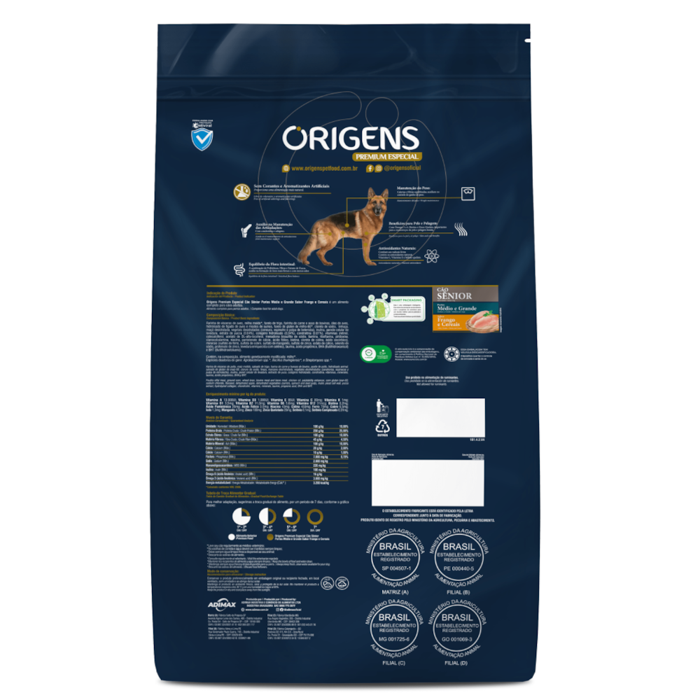 Origens Cão Sênior Sabor Frango e Cereais possui ingredientes de alta qualidade e não contém corantes e aromatizantes artificiais.