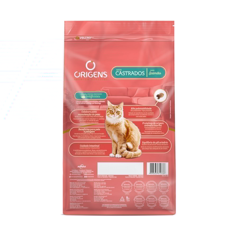 Farinha de vísceras de aves, milho integral moído, farinha de peixes, proteína isolada de suíno (farinha de torresmo), farelo de glúten de milho-60, polpa de beterraba, farelo de trigo, óleo de vísceras de aves, óleo de peixes (salmão); palatabilizante de vísceras de suíno e frango, cloreto de sódio (sal comum), semente de linhaça, prebióticos (parede celular de levedura, inulina), extrato de yucca (0,03%), vitaminas (A, D3, E, K3, B1, B2, B12, biotina, pantotenato de cálcio, niacina, cloreto de colina), minerais (sulfato de ferro, sulfato de cobre, iodato de cálcio, óxido de manganês, óxido de zinco, proteinato de zinco, selenito de sódio, selênio levedura), taurina, ácido fosfórico, metionina, ácido propiônico, BHA, BHT. Contém, na composição, alimento geneticamente modificado: milho*.