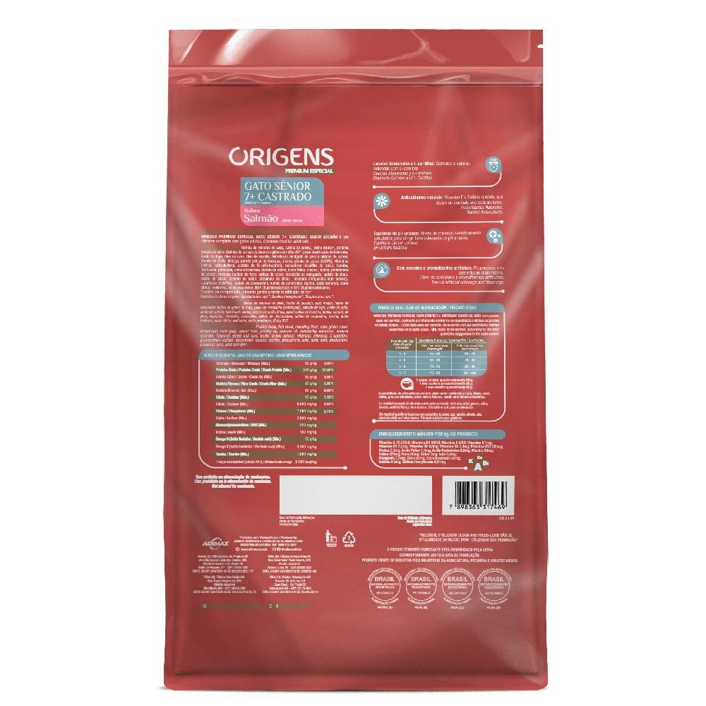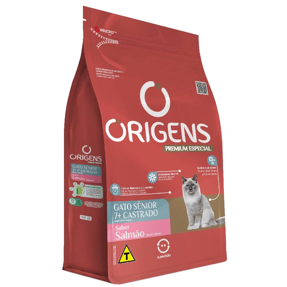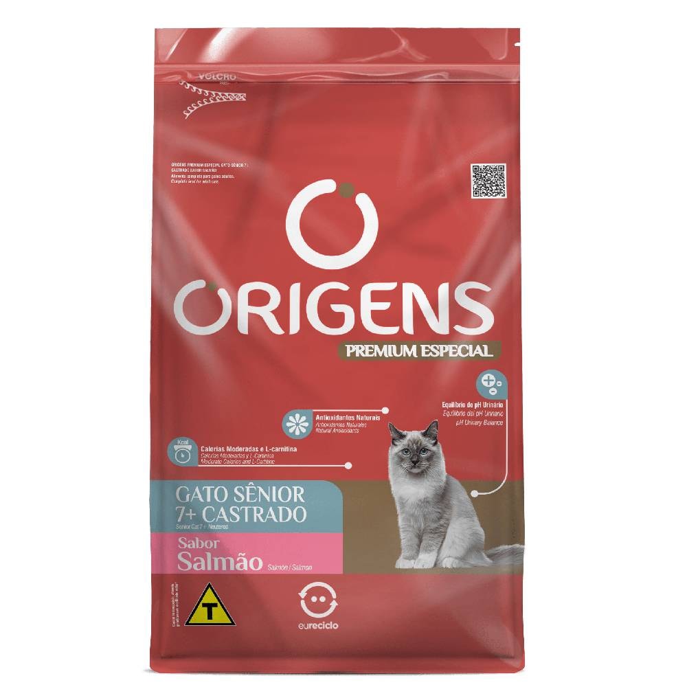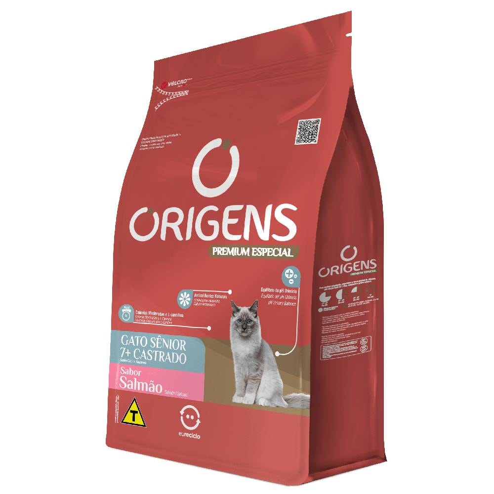 Detalhes do Produto Origens é uma linha de alimentos Premium Especial que nutre o que há de melhor: o amor. Promover saúde e prazer a cada refeição é antes de tudo um ato de carinho, que estreita laços e prolonga os dias de alegria, amizade e amor incondicional entre tutores e seus cães e gatos. Origens Premium Especial Gato Sênior 7+ Castrado Sabor Salmão possui ingredientes de alta qualidade e não contém corantes e aromatizantes artificiais.
