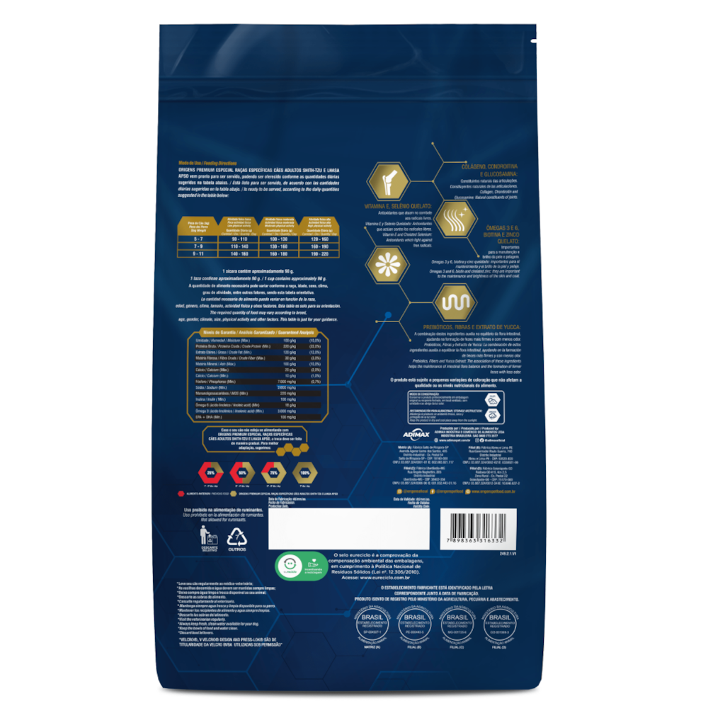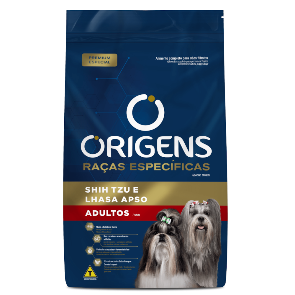 Descrição do Produto Origens Raças Específicas é uma linha de alimentos Premium Especial para raças específicas que nutre o que há de melhor: o amor. Promover saúde e prazer a cada refeição é antes de tudo um ato de carinho, que estreita laços e prolonga os dias de alegria, amizade e amor incondicional entre tutores e seus cães. Origens Raças Específicas Shih Tzu e Lhasa Apso não contém corantes e aromatizantes artificiais e possui uma nutrição específica para cães adultos das raças Shih Tzu e Lhasa Apso.