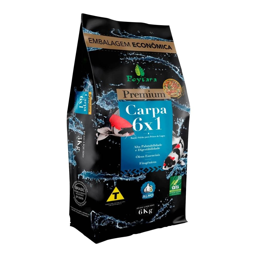 Poytara Carpa 6x1 é um alimento completo, formulado para atender às necessidades nutricionais e suprir a manutenção diária de carpas, Koi e peixes de lagos, que possuam hábito alimentar similar ao das carpas, com níveis adequados de nutrientes promovendo um bom crescimento e saúde para os peixes. É o melhor custo x benefício para seu lago.