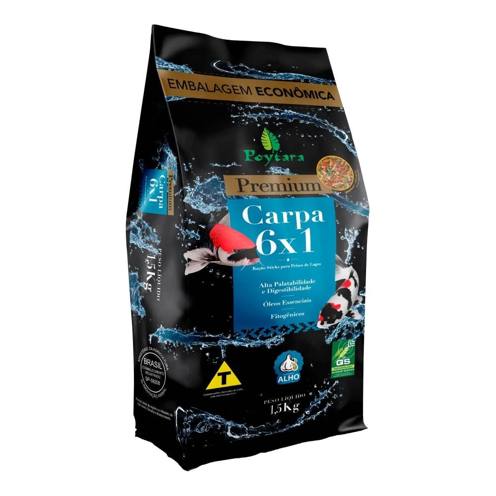 Poytara Carpa 6x1 é um alimento completo, formulado para atender às necessidades nutricionais e suprir a manutenção diária de carpas, Koi e peixes de lagos, que possuam hábito alimentar similar ao das carpas, com níveis adequados de nutrientes promovendo um bom crescimento e saúde para os peixes. É o melhor custo x benefício para seu lago.