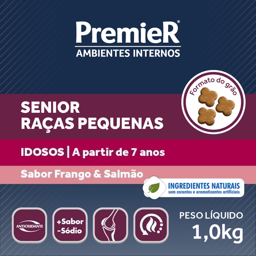 Este é um alimento completo destinado para cães idosos que vivem dentro de casa. A Ração Premier Ambientes Internos Cães Sênior Raças Pequenas - Sabor Frango e Salmão - oferece mais saúde e longevidade graças a sua formulação específica. Seus grãos foram feitos de forma que facilitam a mastigação do pet e ainda combina ingredientes de alto aproveitamento e fibras especiais. Além disso, reduz o volume e odor das fezes através do extrato de yucca.