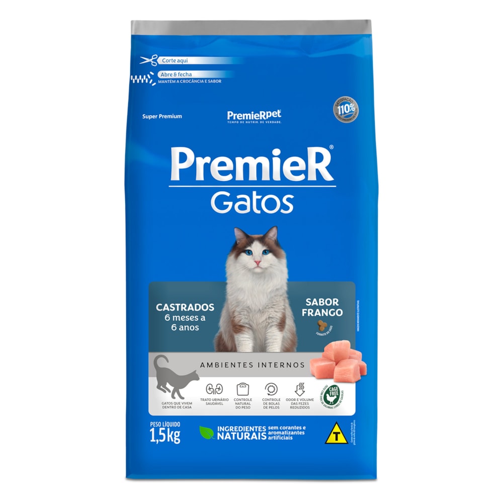 A Ração PremieR Gatos Castrados 6 meses a 6 anos Sabor Frango é um alimento Super Premium que faz parte da linha PremieR Gatos Castrados, uma linha de alimentos especialmente desenvolvida para garantir o máximo em saúde e vitalidade aos gatos através de cuidados nutricionais específicos pós castração. Com foco em promover a manutenção do peso ideal e a saúde do trato urinário nos gatos castrados, estes alimentos apresentam-se divididos por faixa etária, já que tanto o peso quanto a incidência dos cálculos urinários varia em função da idade. Esta forma de apresentação garante alta precisão nos benefícios oferecidos e permite agregar cuidados gerais inerentes a cada fase da vida. Além disso, a combinação de ingredientes especiais com o alto aproveitamento dos nutrientes reduz o odor e volume das fezes minimizando possíveis inconvenientes de uma vida dentro de casa, facilitando o convívio entre o dono e seu gato.