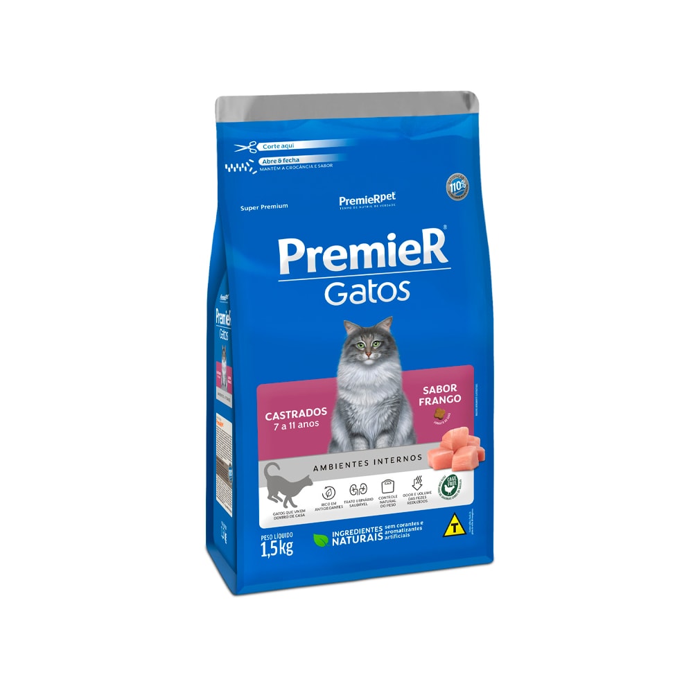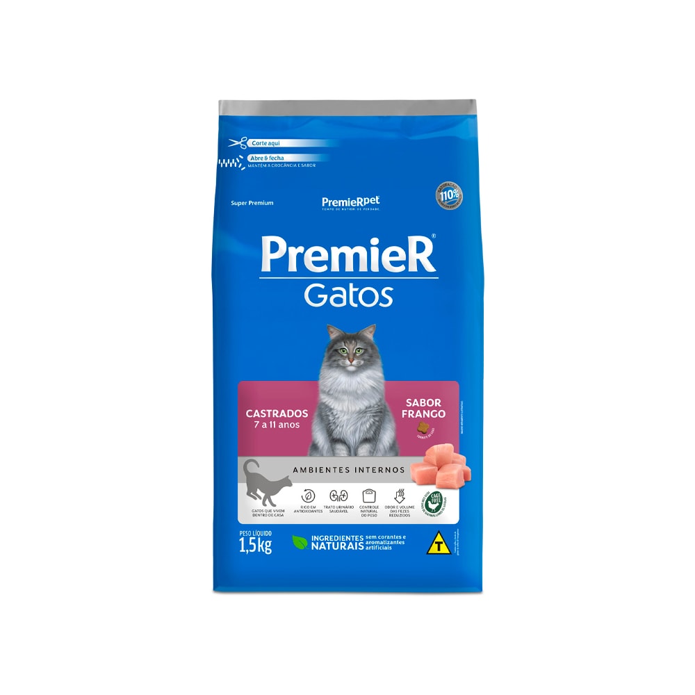 A Ração PremieR Gatos Castrados 7 a 11 anos Sabor Frango é um alimento Super Premium que faz parte da linha PremieR Gatos Castrados, uma linha de alimentos especialmente desenvolvida para garantir o máximo em saúde e vitalidade aos gatos através de cuidados nutricionais específicos pós castração. Com foco em promover a manutenção do peso ideal e a saúde do trato urinário nos gatos castrados, estes alimentos apresentam-se divididos por faixa etária, já que tanto o peso quanto a incidência dos cálculos urinários varia em função da idade. Esta forma de apresentação garante alta precisão nos benefícios oferecidos e permite agregar cuidados gerais inerentes a cada fase da vida. Além disso, a combinação de ingredientes especiais com o alto aproveitamento dos nutrientes reduz o odor e volume das fezes minimizando possíveis inconvenientes de uma vida dentro de casa, facilitando o convívio entre o dono e seu gato.