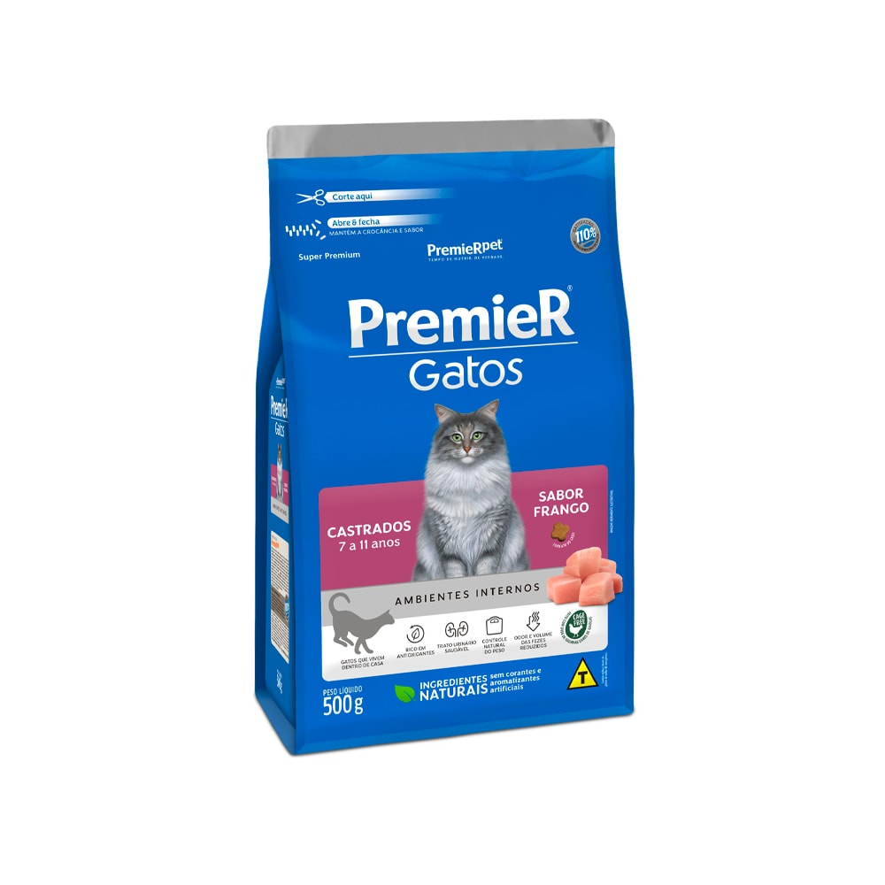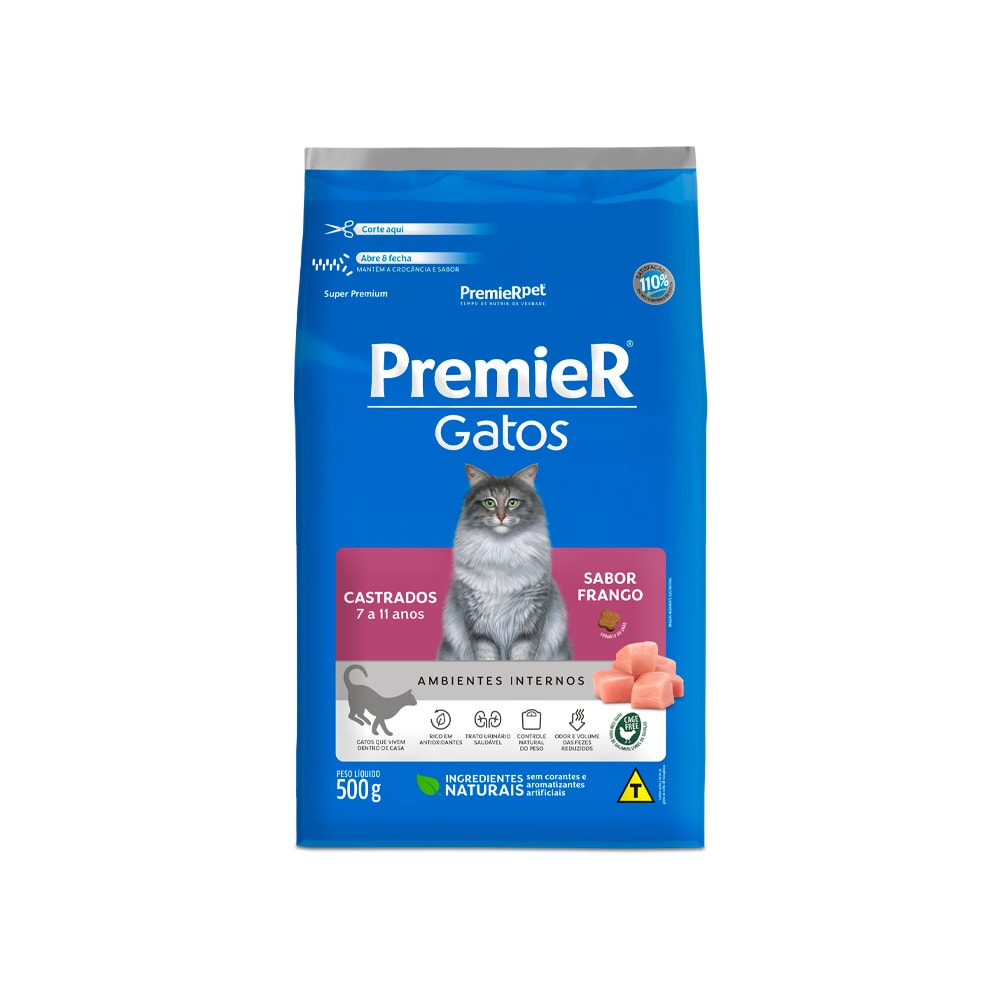 A Ração PremieR Gatos Castrados 7 a 11 anos Sabor Frango é um alimento Super Premium que faz parte da linha PremieR Gatos Castrados, uma linha de alimentos especialmente desenvolvida para garantir o máximo em saúde e vitalidade aos gatos através de cuidados nutricionais específicos pós castração. Com foco em promover a manutenção do peso ideal e a saúde do trato urinário nos gatos castrados, estes alimentos apresentam-se divididos por faixa etária, já que tanto o peso quanto a incidência dos cálculos urinários varia em função da idade. Esta forma de apresentação garante alta precisão nos benefícios oferecidos e permite agregar cuidados gerais inerentes a cada fase da vida. Além disso, a combinação de ingredientes especiais com o alto aproveitamento dos nutrientes reduz o odor e volume das fezes minimizando possíveis inconvenientes de uma vida dentro de casa, facilitando o convívio entre o dono e seu gato.