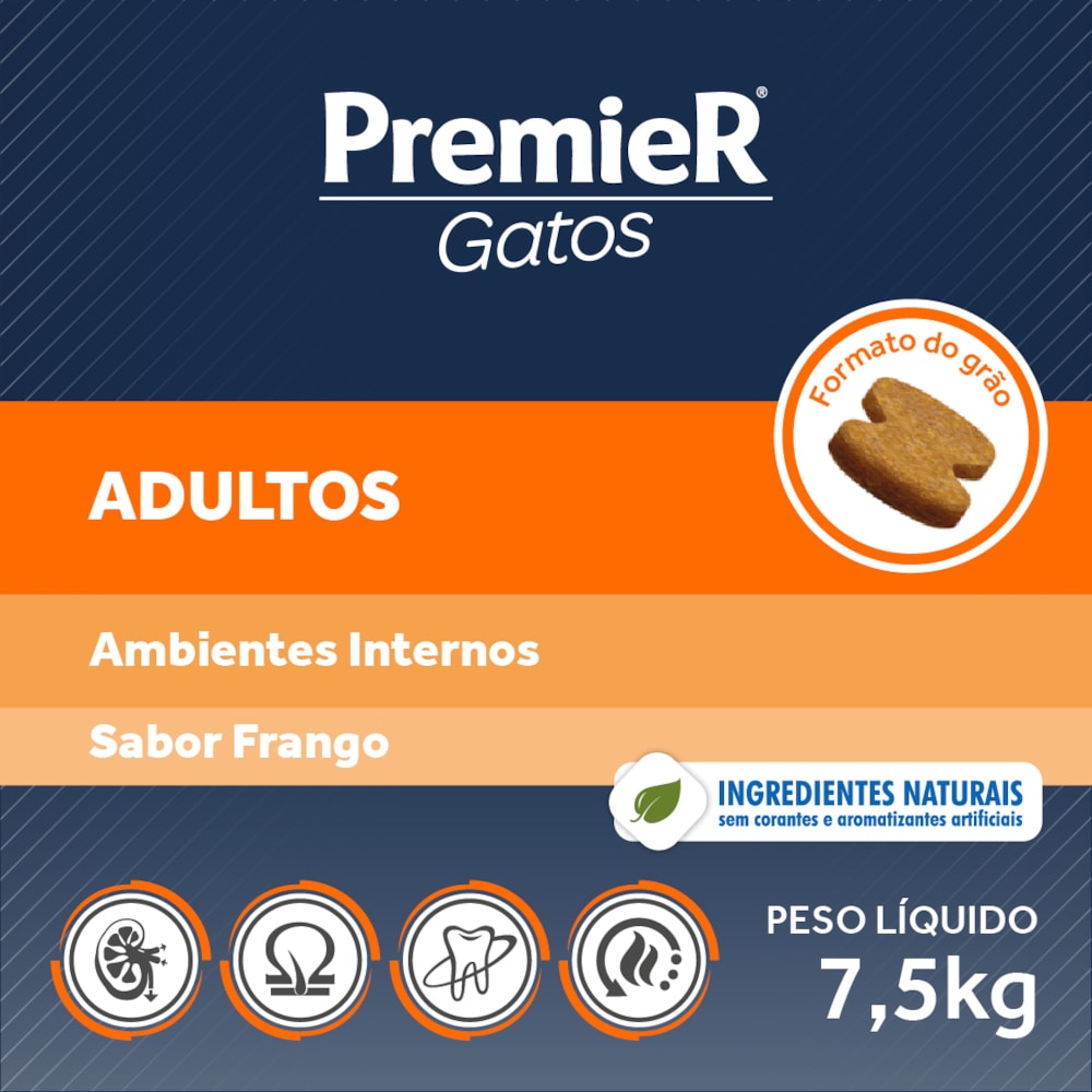 Com 32% de proteína, é indicado para gatos adultos a partir de 1 ano de idade. Contém Ômegas 3 e 6 e Zinco que ajudam a manter a pele protegida reduzindo a queda de pelos. Possui ainda Extrato de Yucca que reduz o odor das fezes em até 50%. As proteínas da Ração Premier Ambientes Internos Gatos Adultos Sabor Frango são de alta qualidade e seus ingredientes naturais resultando em alta palatabilidade. Sua composição também é enriquecida de Vitamina A, C, E, B12, D3 e K3 que facilitam a absorção e equilibram a demanda nutricional do seu gato e a Taurina para uma longevidade ativa e com isso proporcionando mais vigor para as atividades do seu gato dia a dia.