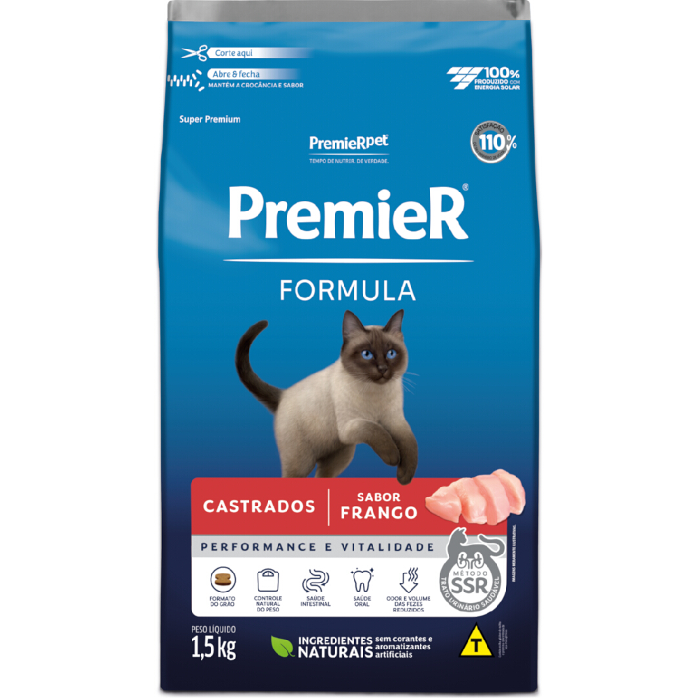 Premier Fórmula Gatos Castrados Frango 1,5KG: Alimento completo e nutritivo para oferecer ao seu gato castrado o melhor da vida, proporcionando-lhe saúde, vitalidade, bem-estar e felicidade para que ele viva uma vida longa e plena ao seu lado.