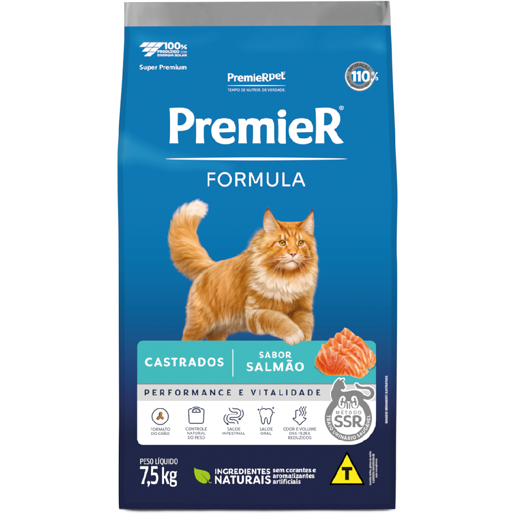 Premier Fórmula Gatos Castrados Salmão 7,5KG: Alimento completo e nutritivo para oferecer ao seu gato castrado o melhor da vida, proporcionando-lhe saúde, vitalidade, bem-estar e felicidade para que ele viva uma vida longa e