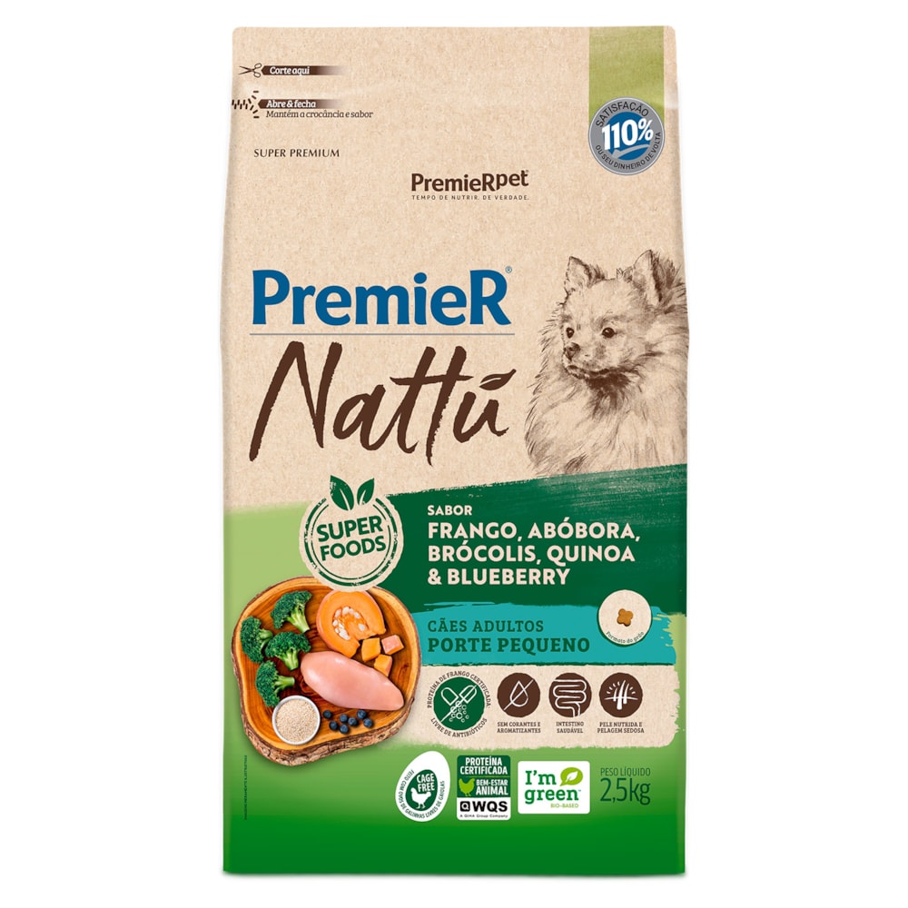 Com uma fórmula sem corantes e aromatizantes, PremieR Nattu Abóbora é recomendado para a alimentação de cães adultos de pequeno porte e traz em sua base de ingredientes Frango, Abóbora, Brócolis, Quinoa e Blueberry, itens de alta densidade nutricional, que oferecem muitos nutrientes e poucas calorias, proporcionando uma dieta mais equilibrada para seu cão.