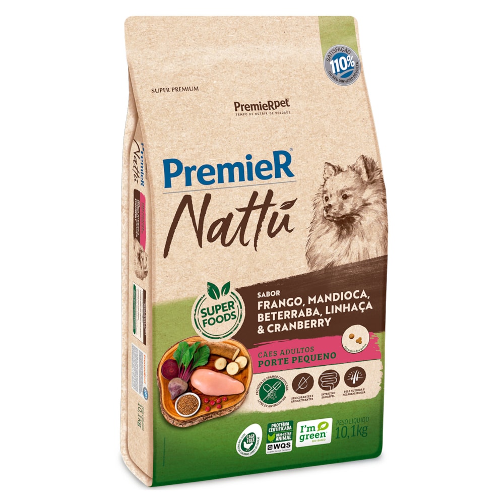Com uma fórmula sem corantes e aromatizantes, PremieR Nattu Mandioca é recomendado para a alimentação de cães adultos de pequeno porte e traz em sua base de ingredientes Frango, Mandioca, Beterraba, Linhaça e Cranberry, itens de alta densidade nutricional, que oferecem muitos nutrientes e poucas calorias, proporcionando uma dieta mais equilibrada para seu cão.