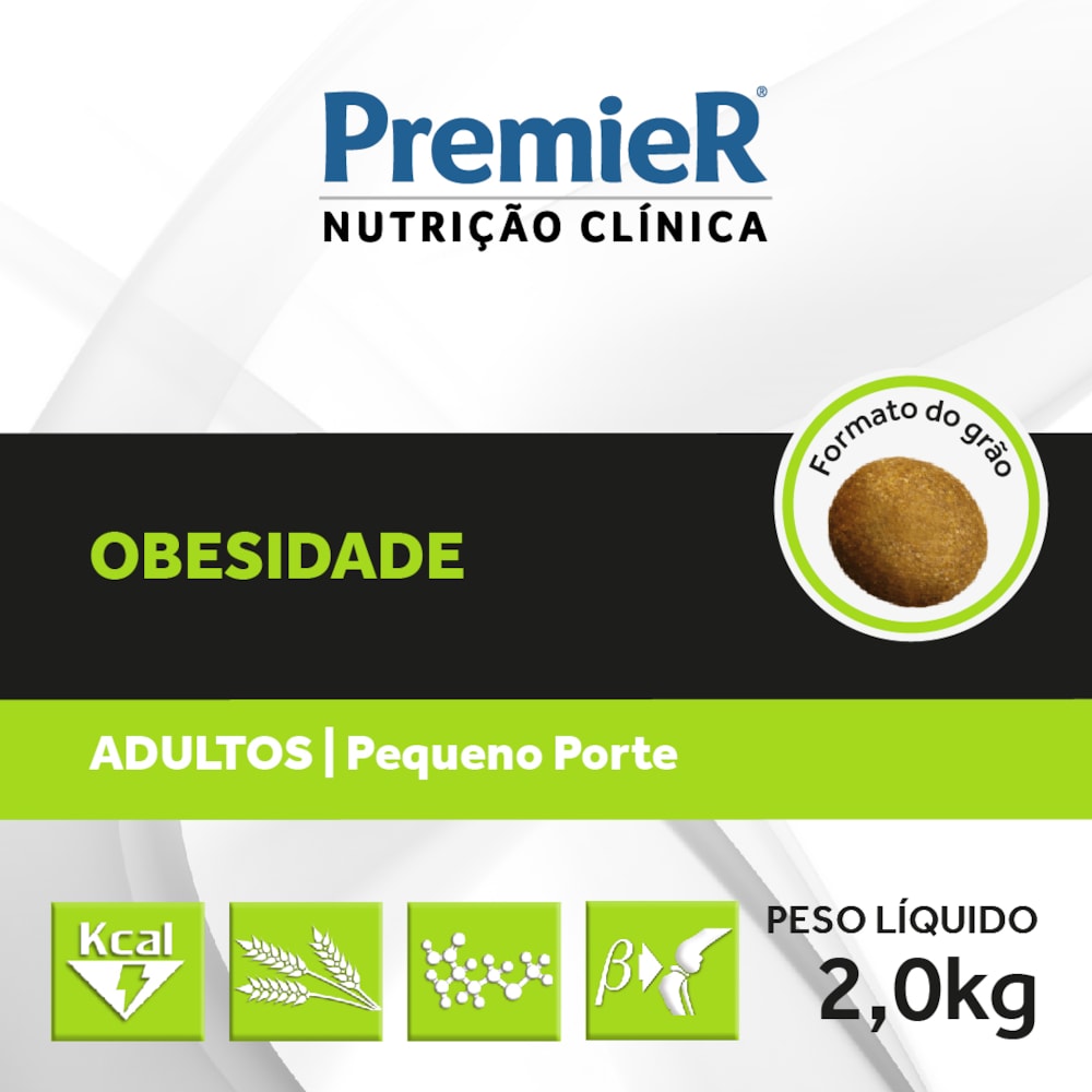 A Ração Premier Nutrição Clínica Obesidade para Cães Adultos de Pequeno Porte é um alimento que possui suas calorias reduzidas com conteúdo nutricional cientificamente balanceado e adequado à baixa ingestão calórica. Possui ainda alto teor de fibras que ajudam na redução calórica e mantêm níveis glicêmicos constantes. Contém altos níveis de proteínas que auxiliam na manutenção da massa magra durante o processo de perda de peso. E ainda contém ß-glucano e gelatina hidrolisada, rica em colágeno, que atuam reduzindo a sintomatologia da osteoartrite, comum nos casos de obesidade.