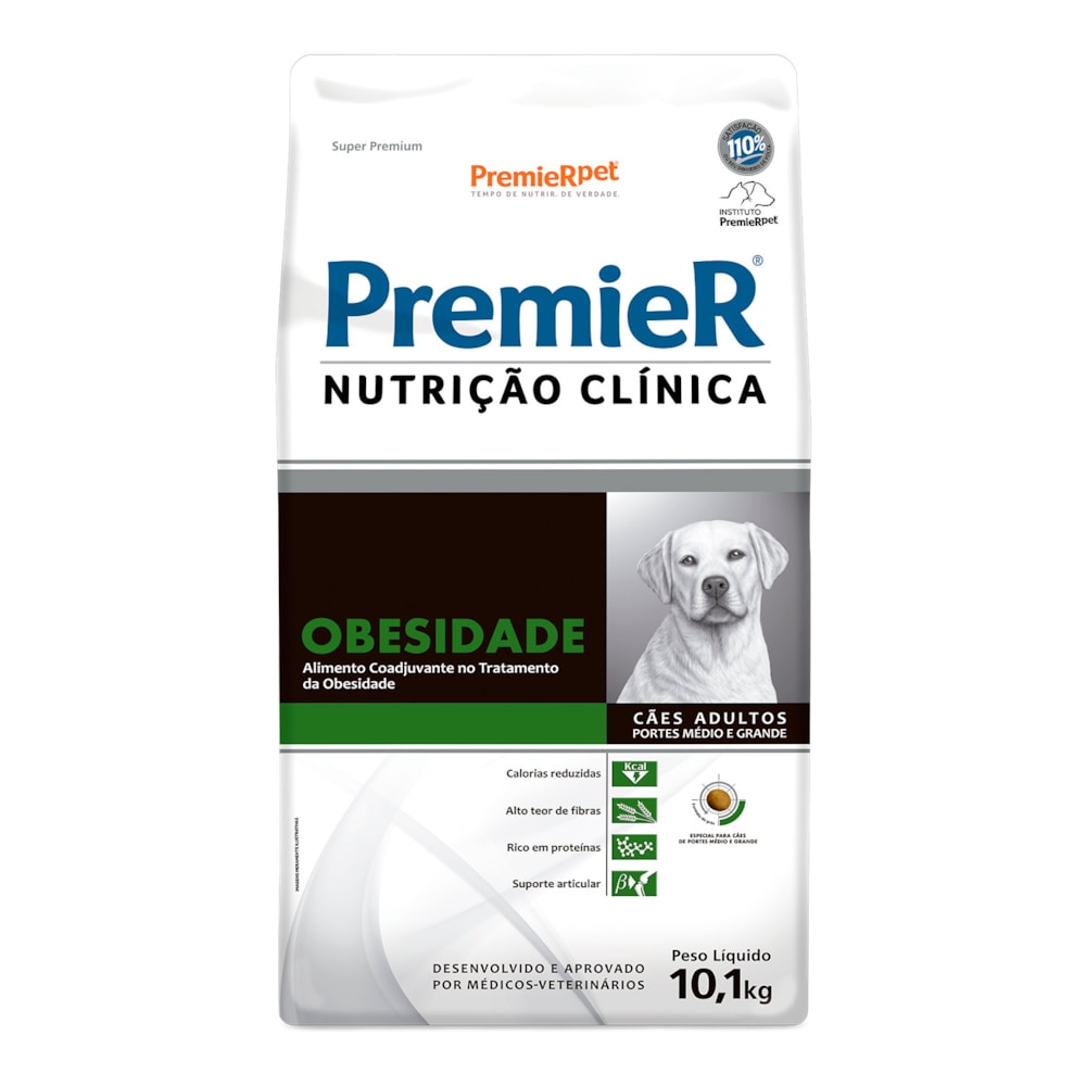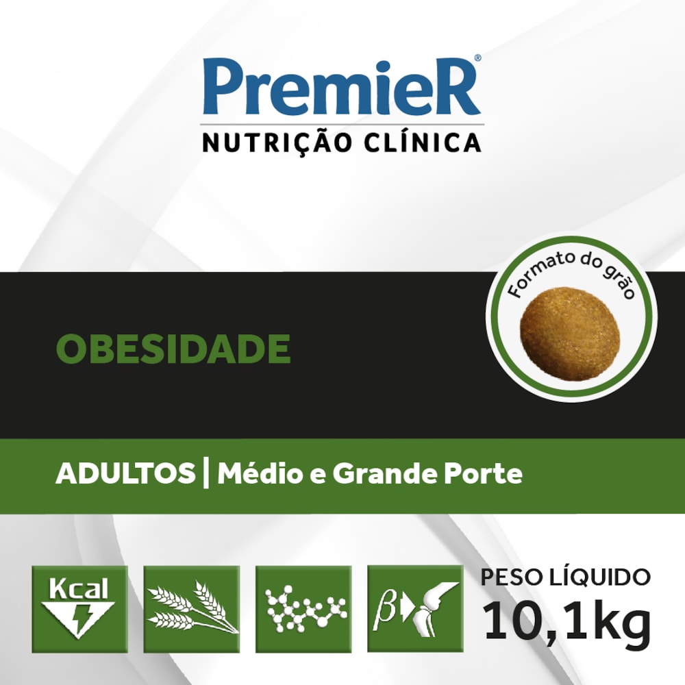 A Ração Premier Nutrição Clínica Obesidade para Cães Adultos de raças Médias e Grandes é um alimento desenvolvido especialmente com conteúdo nutricional cientificamente balanceado e adequado à baixa ingestão calórica. Possui alto teor de fibras e rico em fibras que auxiliam na redução calórica e mantêm níveis glicêmicos constantes. Também possui altos níveis de proteínas que auxiliam na manutenção da massa magra durante o processo de perda de peso. Contém ß-glucano e gelatina hidrolisada, rica em colágeno, que atuam reduzindo a sintomatologia da osteoartrite, comum nos casos de obesidade. PremieR Nutrição Clínica Obesidade Cães Médio e Grande Portes é um alimento coadjuvante indicado para cães adultos de portes médio e grande com excesso de peso, para a obtenção do escore corporal ideal. Este alimento pode ser também indicado nos casos de constipação responsiva a fibras e hiperlipidemia.Este produto deve ser utilizado como auxiliar, portanto não substitui o tratamento convencional.