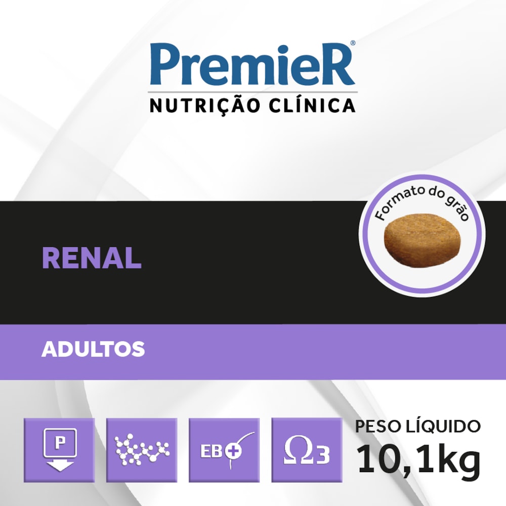 Como um alimento auxiliar e coadjuvante ao tratamento da doença renal crônica e na diminuição da incidência de cálculos renais de oxalato de cálcio em pacientes nefropatas a Ração Premier Nutrição Clínica Renal Para Cães Adultos oferece alguns benefícios para acompanhar o tratamento prescrito pelo médico veterinário, tais como: minimiza os sintomas da retenção de substâcnias tóxicas e perda de elementos importantes na urina, ajuda na diminuição da doença, protege o tecido renal, previne a formação de cálculos urinários. Este alimento deve sempre ser utilizado sob orientação de um profissional. Com 14,5% de proteína, é indicado para cães adultos em tratamento da doença renal crônica e na diminuição da incidência de urólitos de oxalato de cálcio em pacientes nefropatas. A Ração Premier Nutrição Clínica Renal Para Cães Adultos não contém corantes e nem aromatizantes artificiais. Sua composição também é enriquecida de Vitamina A, C, E, B12, D3 e K3 que facilitam a absorção e equilibram a demanda nutricional do seu cão, Ômegas 3 e 6 e Zinco Orgânico que ajudam a manter a pele protegida e reduz a queda de pelos e o DHA que estimula a capacidade de aprendizagem, proporcionando mais vigor para as atividades do seu cão dia a dia.