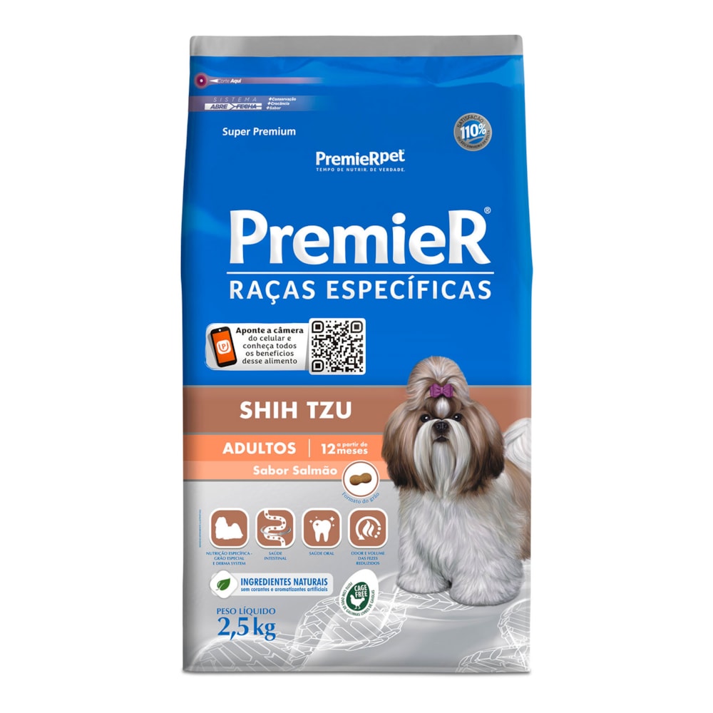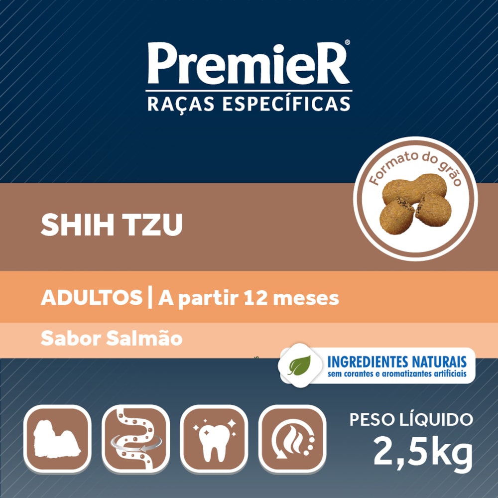 Desenvolvida com nobres ingredientes e alta tecnologia a Ração Premier Raças Específicas Para Cães Adultos Shih Tzu Sabor Salmão oferece benefícios exclusivos para minimizar os problemas de saúde das raças específicas. É um alimento completo para manter a saúde e a beleza do seu cão. Ela oferece a redução do volume e odor das fezes através do Extrato de Yucca. Com 25% de proteína, é indicado para cães adultos da raça Shih Tzu em manutenção. A Ração Premier Raças Específicas Para Cães Adultos Shih Tzu Sabor Salmão possuí Ômegas 3 e 6 e Zinco que ajudam a manter a pele protegida reduzindo a queda de pelos e não contém corantes e nem aromatizantes artificiais. As proteínas da Ração Premier Raças Específicas Para Cães Adultos Shih Tzu Sabor Salmão são de altíssima qualidade e seus ingredientes naturais resultando em alta palatabilidade. Cuidam da saúde intestinal e oral. Sua composição também é enriquecida de Vitamina A, C, E, B12, D3 e K3 que facilitam a absorção e equilibram a demanda nutricional do seu cão, também contém Glicosamina e Condroitina que protegem as articulações, proporcionando mais vigor para as atividades do seu cão dia a dia.