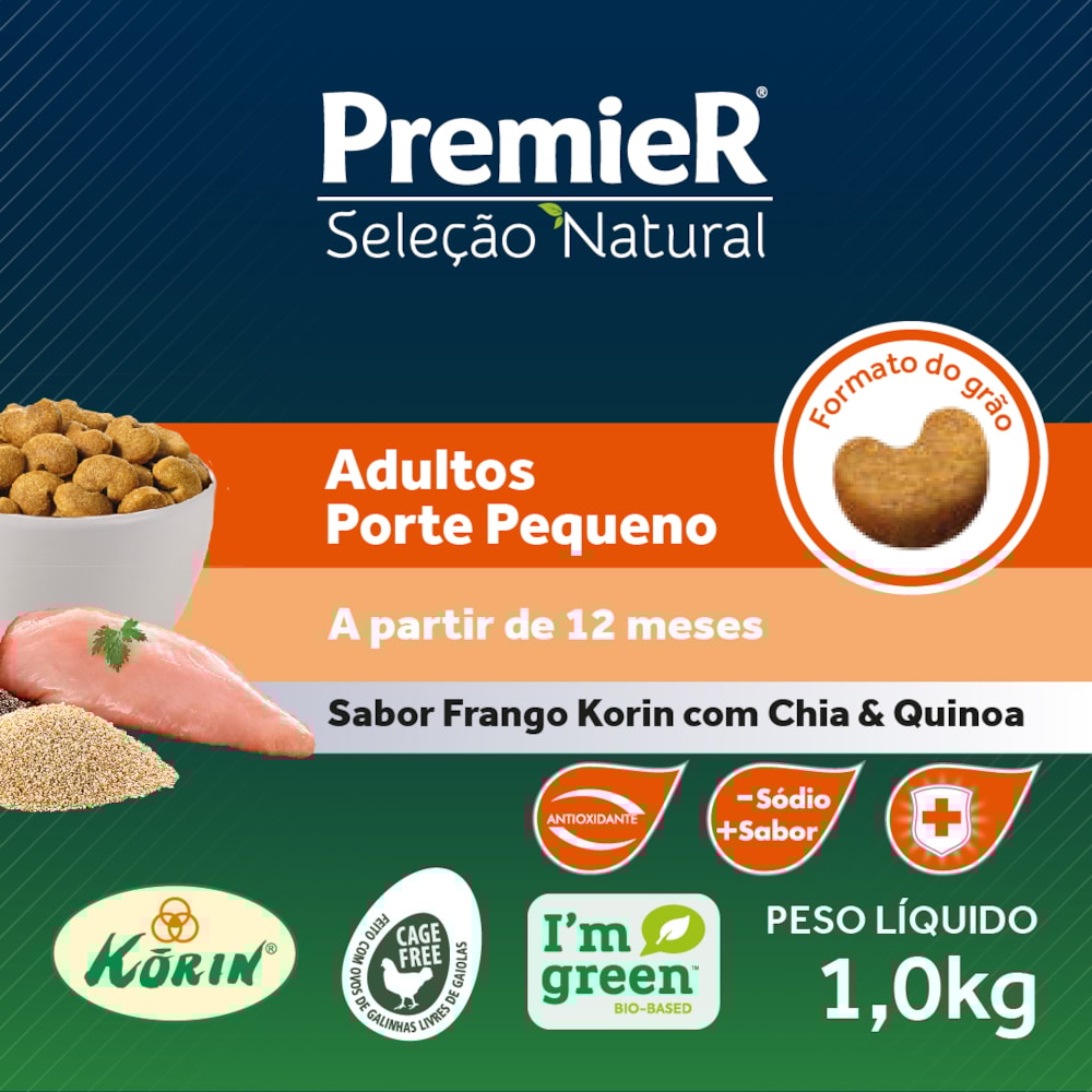 Premier Seleção Natural Chia & Quinoa é mais uma inovação da PremieRpet®. Além de contar com a exclusiva fonte de proteína proveniente do frango Korin, possui na sua formulação chia, quinoa, extrato de marigold, abóbora e cenoura, ingredientes ricos em antioxidantes que auxiliam no combate aos radicais livres. Oferece também o complexo de frutas e vegetais, fontes naturais de fibras e sais minerais. E ainda, para manter o sabor natural dos ingredientes, contém baixo teor de sódio. Outra exclusividade deste alimento são os ovos utilizados em sua formulação, provenientes do sistema de criação Cage Free, no qual as aves possuem liberdade de movimento, com acesso a ninhos, permitindo assim sua total locomoção.