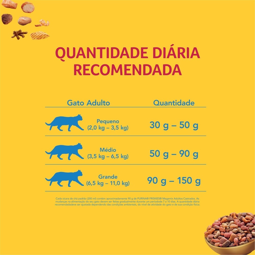 Detalhes do Produto PURINA® FRISKIES® Megamix Castrados é um alimento completo e balanceado formulado para gatos adultos e castrados. Possui formatos que brincam com a imaginação do seu gato para que ele tenha nutrição, sabor e diversão todos os dias. Pele e pelos saudáveis graças aos níveis adequados de zinco e ácidos graxos essenciais. Visão clara e saudável devido à adição de vitamina A e taurina. Formulado com vitaminas e minerais que auxiliam nas defesas naturais. Músculos fortes e saudáveis devido à presença de fontes de proteínas de alta qualidade.