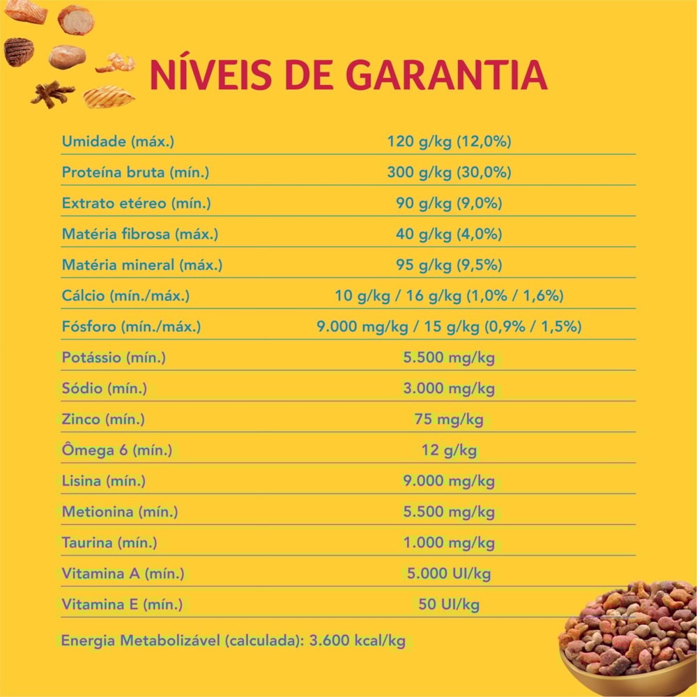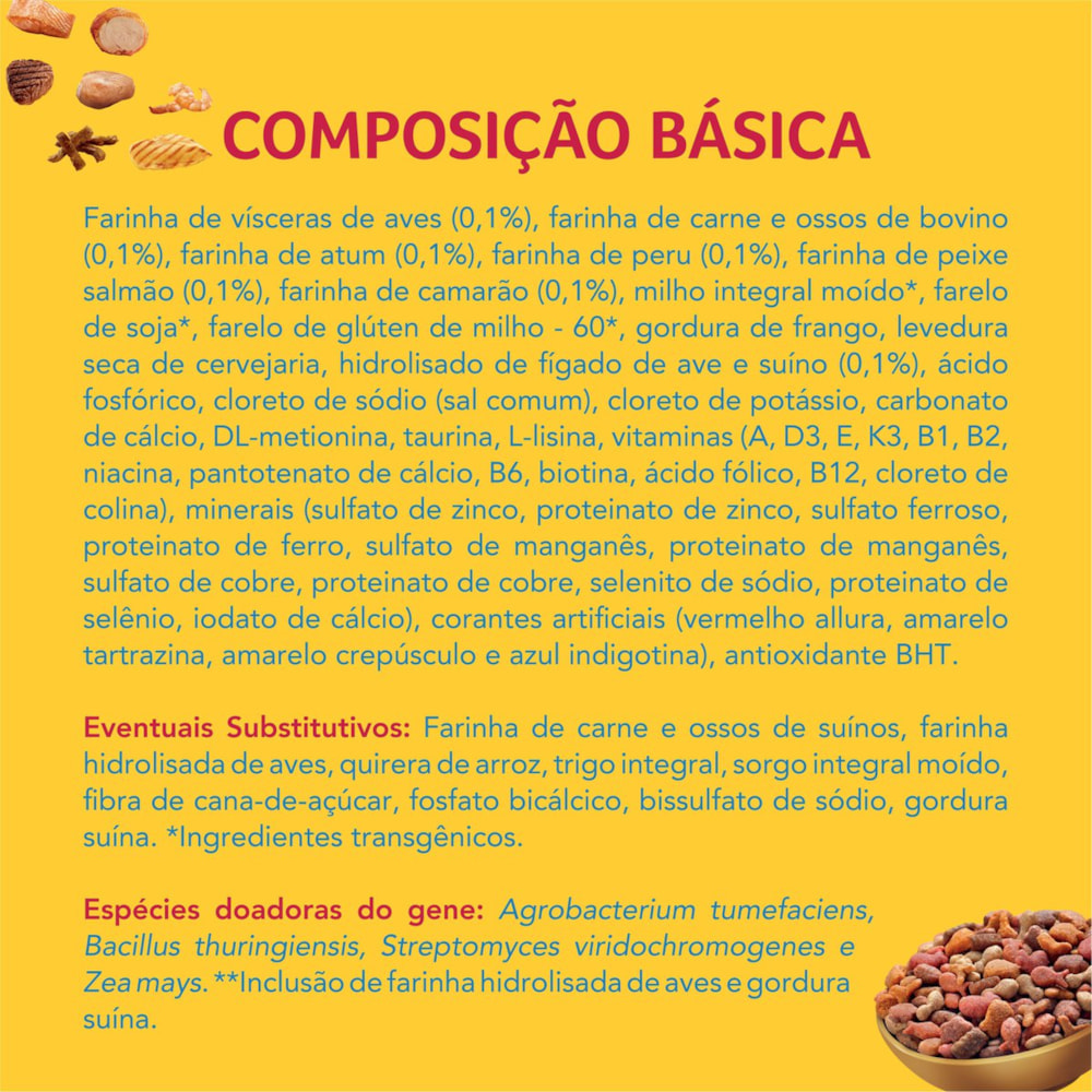 Ingredientes Farinha de subprodutos de frango (1,0%), farinha de carne e ossos de bovino (1,0%), farinha de atum (1,0%), farinha de peru (1,0%), farinha de peixe salmão (1,0%), farinha de camarão (1,0%), milho integral moído*, farelo de soja*, farelo de glúten de milho - 60*, gordura de frango, levedura seca de cervejaria, hidrolisado de fígado de ave e suíno (1,0%), ácido fosfórico, cloreto de sódio (sal comum), cloreto de potássio, carbonato de cálcio, DL-metionina, taurina, L-lisina, vitaminas (A, D3, E, K3, B1, B2, niacina, pantotenato de cálcio, B6, biotina, ácido fólico, B12, cloreto de colina), minerais (sulfato de zinco, proteinato de zinco, sulfato ferroso, proteinato de ferro, sulfato de manganês, proteinato de manganês, sulfato de cobre, proteinato de cobre, selenito de sódio, proteinato de selênio, iodato de cálcio), corantes (corante artificial vermelho allura, corante artificial amarelo tartrazina, corante artificial amarelo crepúsculo e corante artificial azul indigotina), antioxidante BHT. *Ingredientes transgênicos. Espécies doadoras do gene: Agrobacterium tumefaciens, Arabidopsis thaliana, Bacillus thuringiensis, Streptomyces viridochromogenes e Zea mays.