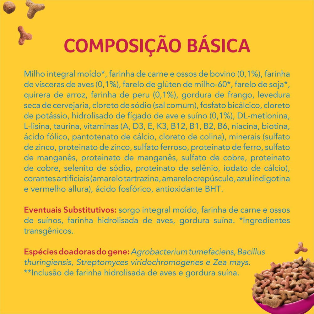 USO PROIBIDO NA ALIMENTAÇÃO DE RUMINANTES. Informação Nutricional Níveis de garantia: Umidade (máx.) 120 g/kg, Proteína Bruta (mín.) 300 g/kg, Extrato Etéreo (mín.) 90 g/kg, Matéria Fibrosa (máx.) 40 g/kg, Matéria Mineral (máx.) 85 g/kg, Cálcio (mín. / máx.) 10 g/kg / 15 g/kg, Fósforo (mín. / máx.) 8.000 mg/kg / 14 g/kg, Potássio (mín.) 5.500 mg/kg, Sódio (mín.) 3.000 mg/kg, Zinco (mín.) 75 mg/kg, Ômega 6 (mín.) 12 g/kg, Lisina (mín.) 9.000 mg/kg, Metionina (mín.) 5.500 mg/kg, Taurina (mín.) 1.000 mg/kg, Vitamina A (mín.) 5.000 UI/kg, Vitamina E (mín.) 50 UI/kg Ingredientes Milho integral moído*, farinha de carne e ossos de bovinos, farinha de subprodutos de frango, farelo de glúten de milho*, farelo de soja*, quirera de arroz, farinha de subprodutos de peru, gordura animal estabilizada, levedura seca de cervejaria, cloreto de sódio (sal comum), fosfato bicálcico, cloreto de potássio, hidrolisado de fígado de ave e suíno, DL-metionina, L-lisina, taurina, vitaminas (A, D3, E, K3, B12, mononitrato de tiamina, suplemento de riboflavina, cloridrato de piridoxina, niacina, biotina, ácido fólico, pantotenato de cálcio, cloreto de colina), minerais (sulfato de zinco, sulfato ferroso, sulfato de cobre, sulfato de manganês, iodato de cálcio, selenito de sódio), corantes (amarelo 5, amarelo 6, azul 2, vermelho 40 e dióxido de titânio), ácido fosfórico, antioxidante BHT. *Espécies doadoras do gene: Agrobacterium tumefaciens, Bacillus thuringiensis e Streptomyces viridochromogenes. Você já conhece a Agrosolo?Código de Barras 7891000069905