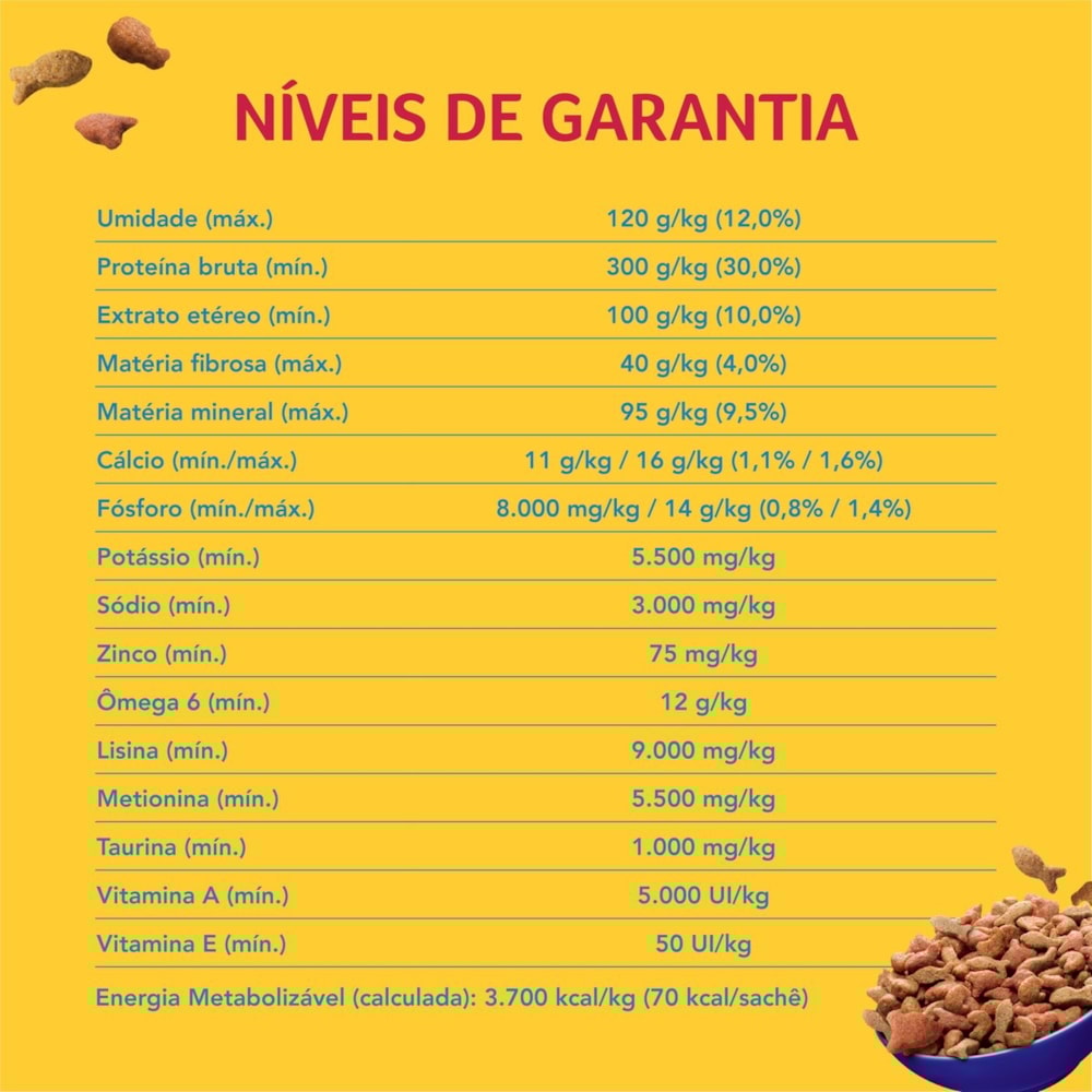 Informação Nutricional: Níveis de garantia: Umidade (máx.) 120 g/kg, Proteína Bruta (mín.) 300 g/kg, Extrato Etéreo (mín.) 90 g/kg, Matéria Fibrosa (máx.) 40 g/kg, Matéria Mineral (máx.) 85 g/kg, Cálcio (mín. / máx.) 10 g/kg / 15 g/kg, Fósforo (mín. / máx.) 8.000 mg/kg / 14 g/kg, Potássio (mín.) 5.500 mg/kg, Sódio (mín.) 3.000 mg/kg, Zinco (mín.) 75 mg/kg, Ômega 6 (mín.) 12 g/kg, Lisina (mín.) 9.000 mg/kg, Metionina (mín.) 5.500 mg/kg, Taurina (mín.) 1.000 mg/kg, Vitamina A (mín.) 5.000 UI/kg, Vitamina E (mín.) 50 UI/kgIngredientes: Milho integral moído*, farelo de glúten de milho*, farinha de subprodutos de frango, quirera de arroz, farinha de camarão, farinha de atum, sardinha, farelo de soja*, gordura animal estabilizada, levedura seca de cervejaria, cloreto de sódio (sal comum), fosfato bicálcico, cloreto de potássio, hidrolisado de fígado de ave e suíno, DL-metionina, L-lisina, taurina, vitaminas (A, D3, E, K3, B12, mononitrato de tiamina, suplemento de riboflavina, cloridrato de piridoxina, niacina, biotina, ácido fólico, pantotenato de cálcio, cloreto de colina), minerais (sulfato de zinco, sulfato ferroso, sulfato de cobre, sulfato de manganês, iodato de cálcio, selenito de sódio), corantes (amarelo 6, vermelho 40 e dióxido de titânio), ácido fosfórico, antioxidante BHT. *Espécies doadoras do gene: Agrobacterium tumefaciens, Bacillus thuringiensis e Streptomyces viridochromogenes. Você já conhece a Agrosolo?Código de Barras 7891000069431