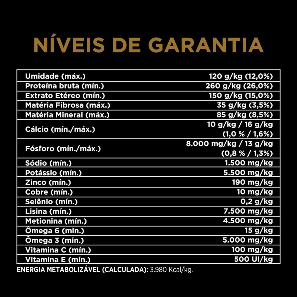 Detalhes do Produto A nutrição mais avançada ao seu alcance. Desenvolvido por cientistas, veterinários e nutricionistas, PRO PLAN® Sensitive Skin traz o poder da nutrição para saúde e bem-estar do seu cão. Carne de salmão como primeiro ingrediente*, fonte de proteína de alto valor biológico e alta digestibilidade que proporciona um nível ótimo de nutrientes de forma eficaz. Nossa tecnologia exclusiva OptiDerma® formulado com altas contribuições de ácidos graxos ômegas 6 e 3 que reforçam a proteção cutânea e promovem uma pele saudável e uma pelagem brilhante. Dieta de alta tolerância para cães sensíveis, com partículas especialmente desenhadas para cães de médio e grande. Contém uma combinação de antioxidantes naturais e minerais essenciais para manter a proteção equilibrada do organismo de cães filhotes e protegê-los contra ameaças externas. Contém ácidos graxos ômegas 6 e 3, vitaminas e minerais essenciais, como cobre e selênio, para a manutenção de uma pele saudável, que serve como a primeira barreira protetora para cães adultos. Formulado com uma fonte alternativa de proteína, como o salmão, que minimiza o risco de irritação da pele. Cada uma de nossas fórmulas possui ingredientes de alta qualidade, selecionados cuidadosamente para uma finalidade específica e em conjunto com os demais ingredientes, tem o objetivo de proporcionar os melhores resultados para seu cão. PURINA® PRO PLAN® oferece produtos de alta qualidade, fabricados com ingredientes selecionados. Por isso, oferecemos um programa de 100% de satisfação garantida ou seu dinheiro de volta. *Carne e/ou derivados de salmão.Informação Nutricional: Níveis de garantia: Umidade (máx.) 120 g/kg (12,0%) Proteína bruta (mín.) 260 g/kg (26,0%) Extrato Etéreo (mín.) 150 g/kg (15,0%) Matéria Fibrosa (máx.) 35 g/kg (3,5%) Matéria Mineral (máx.) 85 g/kg (8,5%) Cálcio (mín./máx.) 10 g/kg / 16 g/kg (1,0 % / 1,6%) Fósforo (mín./máx.) 8.000 mg/kg / 13 g/kg (0,8 % / 1,3%) Sódio (mín.) 1.500 mg/kg Potássio (mín.) 5.500 mg/kg Zinco (mín.) 190 mg/kg Cobre (mín.) 10 mg/kg Selênio (mín.) 0,2 mg/kg Lisina (mín.) 7.500 mg/kg Metionina (mín.) 4.500 mg/kg Ômega 6 (min.) 15 g/kg Ômega 3 (min.) 5.000 mg/kg Vitamina C (mín.) 100 mg/kg Vitamina E (mín.) 500 UI/kgIngredientes: Composição básica: Salmão (19%), milho integral moído*, farinha de atum, farelo de glúten de milho-60*, quirera de arroz, polpa de beterraba, gordura de frango (preservada com tocoferóis, fonte de vitamina E), óleo de peixe refinado, zeolita, cloreto de sódio (sal comum), cloreto de potássio, carbonato de cálcio, fibra de cana-de-açúcar, hidrolisado de fígado de ave e suíno, L-lisina, DL- Metionina, vitaminas (A, D3, E, K3, B1, B2, niacina, pantotenato de cálcio, B6, biotina, ácido fólico, B12, C, cloreto de colina), minerais (sulfato de zinco, sulfato ferroso, sulfato de manganês, sulfato de cobre, proteinato de zinco, proteinato de ferro, proteinato de manganês, proteinato de cobre, proteinato de selênio, iodato de cálcio, selenito de sódio), sorbato de potássio, sulfato de magnésio, antioxidante BHT. Eventuais substitutivos: fosfato bicálcico, farinha da alga Schizochytrium sp., farinha de peixe, levedura seca de cervejaria, ovo em pó, hidrolisado de fígado de aves, hidrolisado de fígado de suíno, gordura suína, sebo bovino (preservado com tocoferóis, fonte de vitamina E) *Ingredientes transgênicos. Espécies doadoras do gene: Agrobacterium tumefaciens, Bacillus thuringiensis, Streptomyces viridochromogenes e Zea mays. Enriquecimento por kg de produto (mín): Vitaminas: A (22.000UI), D3 (1.600 UI), K3 (0,1 mg), B1 (23 mg), B2 (14 mg), B3 (130 mg), B5 (29 mg), B6 (12 mg), B7 (0,08 mg), B9 (3 mg), B12 (70µg), Colina (1200 mg); Minerais: Ferro (200 mg), Manganês (65 mg), Iodo (2 mg). Você já conhece a Agrosolo?Código de Barras 7891000322321