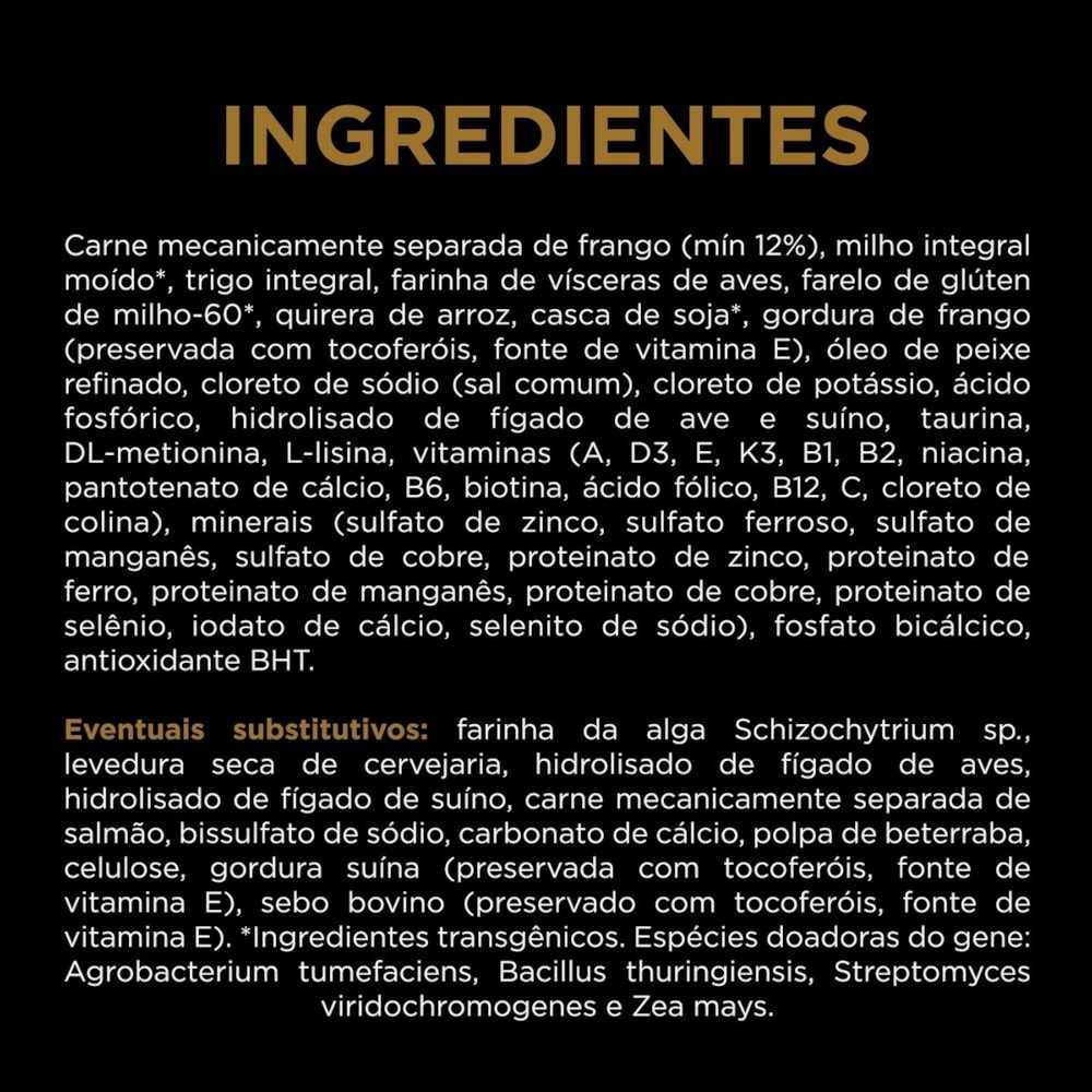Detalhes do Produto A nutrição mais avançada ao seu alcance. Desenvolvido por cientistas, veterinários e nutricionistas, PRO PLAN® Trato Urinário traz o poder da nutrição para saúde e bem-estar do seu gato. Carne de frango como primeiro ingrediente, fonte de proteína de alto valor biológico e alta digestibilidade que proporciona um ótimo nível de nutrientes de forma eficaz. Nossa tecnologia exclusiva OptiTact® é uma combinação exclusiva de nutrientes que ajuda a manter e proteger a saúde do trato urinário inferior de gatos adultos. Foi especialmente formulada para obter um pH urinário ligeiramente mais ácido, estimulando o consumo de água pois possui os níveis adequados de sódio. Cada uma de nossas fórmulas possui ingredientes de alta qualidade, selecionados cuidadosamente para uma finalidade específica e em conjunto com os demais ingredientes, tem o objetivo de proporcionar os melhores resultados para seu gato. PURINA® PRO PLAN® oferece produtos de alta qualidade, fabricados com ingredientes selecionados. Por isso, oferecemos um programa de 100% de satisfação garantida ou seu dinheiro de volta.