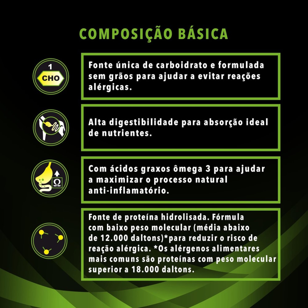 com perda proteica, gastroenterites associadas a alergia alimentar e síndrome de má-absorção. Ingredientes Composição básica: Proteína hidrolisada de frango, farinha de mandioca, farinha da alga Schizochytrium sp.,