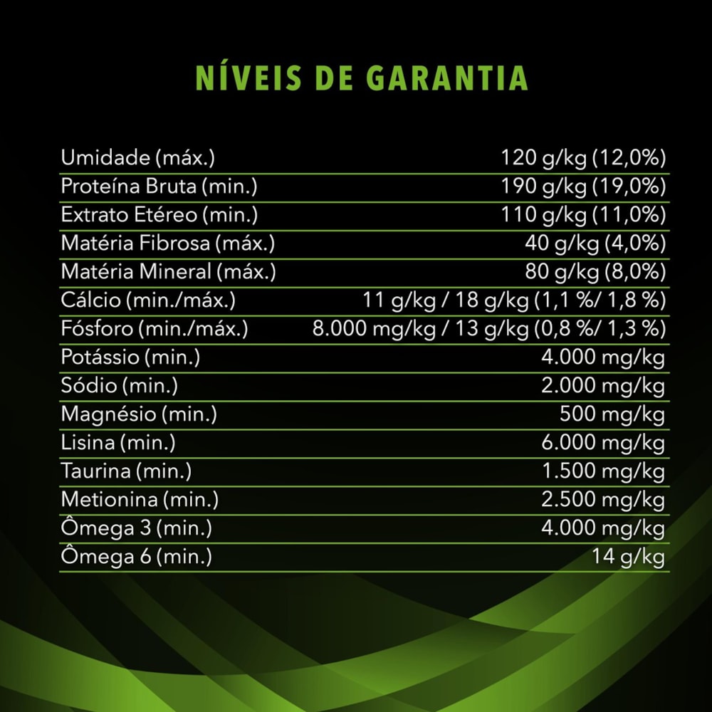 comum), cloreto de potássio, carbonato de cálcio, fosfato bicálcico, hidrolisado de fígado de ave e suíno, L-Lisina,
