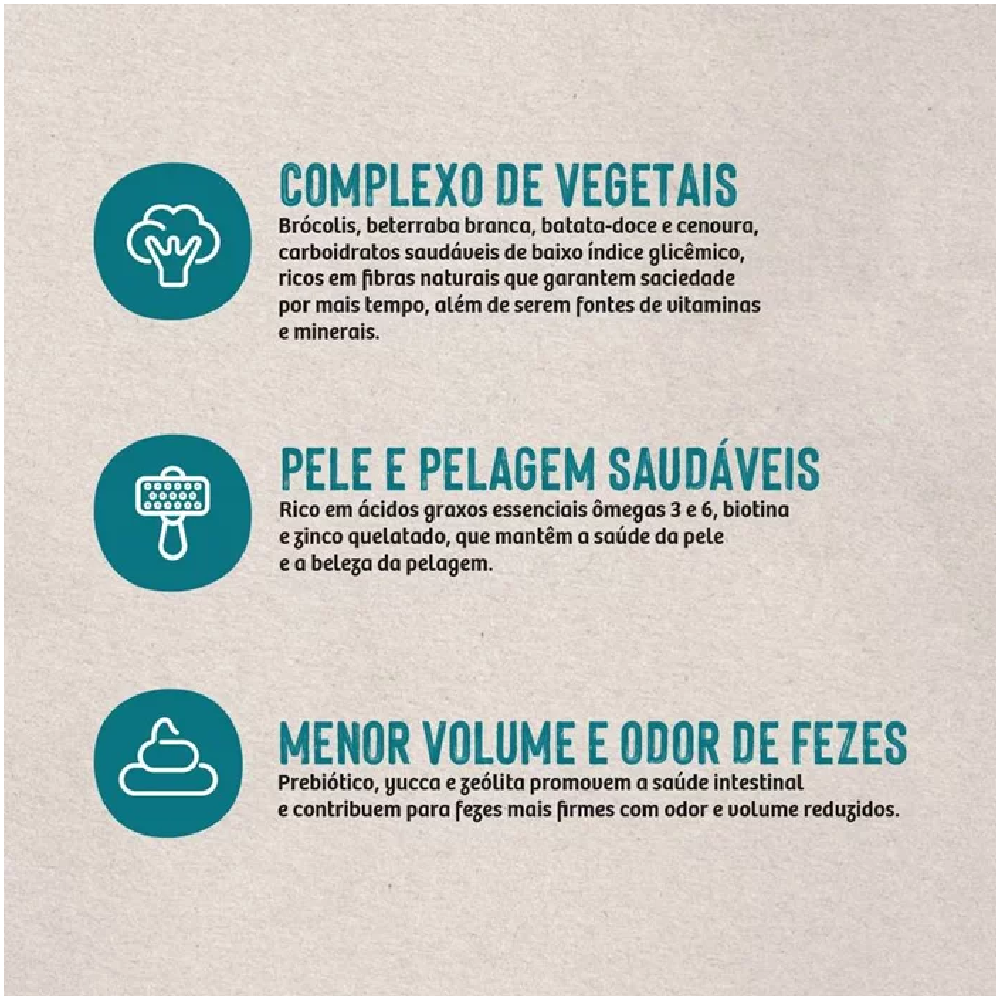 O complexo de vegetais presente na fórmula, composto por brócolis, beterraba branca, batata-doce e cenoura, oferece carboidratos saudáveis de baixo índice glicêmico e ricos em fibras naturais, garantindo saciedade por mais tempo, além de serem fontes de vitaminas e minerais essenciais para a saúde geral do seu cão.