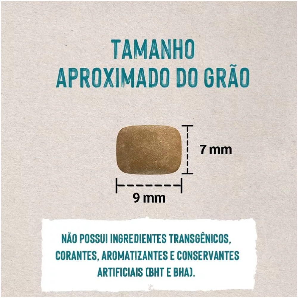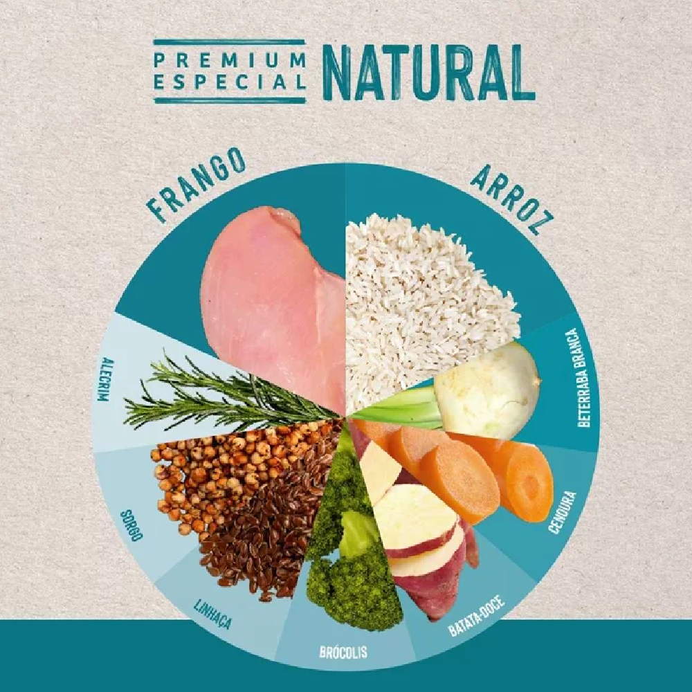 Esta fórmula Premium Especial Natural não contém ingredientes transgênicos, corantes, aromatizantes ou conservantes artificiais, como BHT e BHA, garantindo uma alimentação saudável e segura para o seu cão.