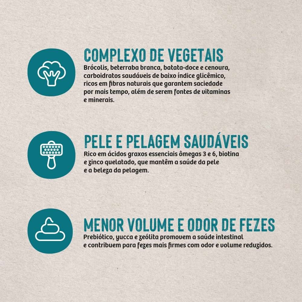 O complexo de vegetais presente na fórmula, composto por brócolis, beterraba branca, batata-doce e cenoura, oferece carboidratos saudáveis de baixo índice glicêmico e ricos em fibras naturais, garantindo saciedade por mais tempo, além de serem fontes de vitaminas e minerais essenciais para a saúde geral do seu cão.