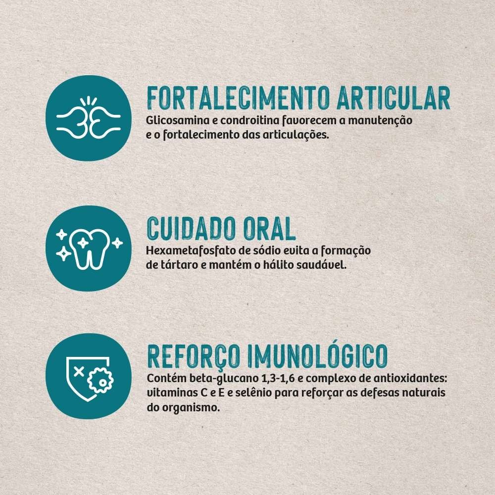Quatree Life Adultos Raças Pequenas cuida da saúde oral do seu cão, graças ao hexametafosfato de sódio, que evita a formação de tártaro e mantém o hálito saudável. Além disso, o fortalecimento articular é promovido pela presença de glicosamina e condroitina, que favorecem a manutenção e o fortalecimento das articulações.