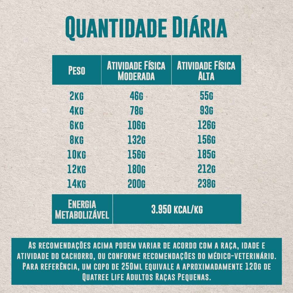 E para completar, Quatree Life é rico em ácidos graxos essenciais ômegas 3 e 6, biotina e zinco quelatado, que mantêm a saúde da pele e a beleza da pelagem do seu cão, proporcionando uma aparência deslumbrante e uma pele saudável.