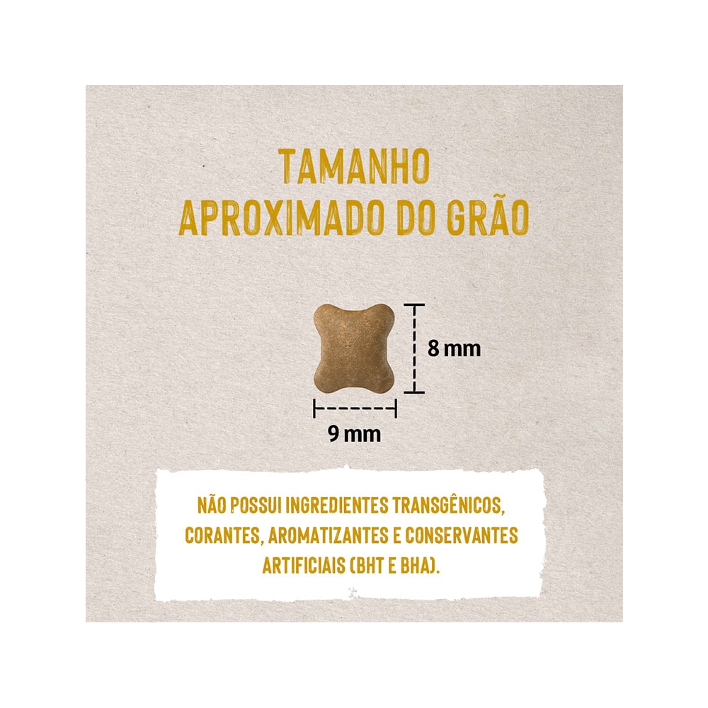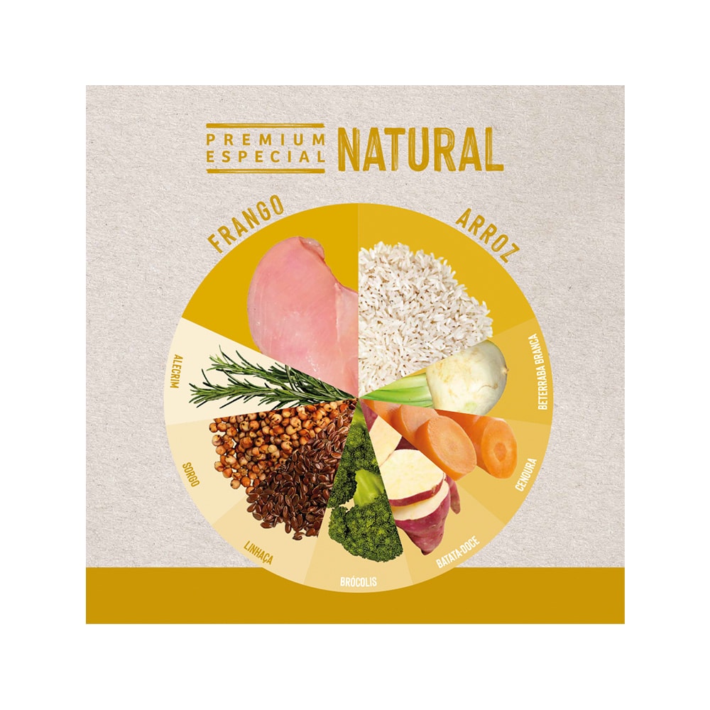 Esta fórmula Premium Especial Natural não contém ingredientes transgênicos, corantes, aromatizantes ou conservantes artificiais, como BHT e BHA, garantindo uma alimentação saudável e segura para o seu cão.