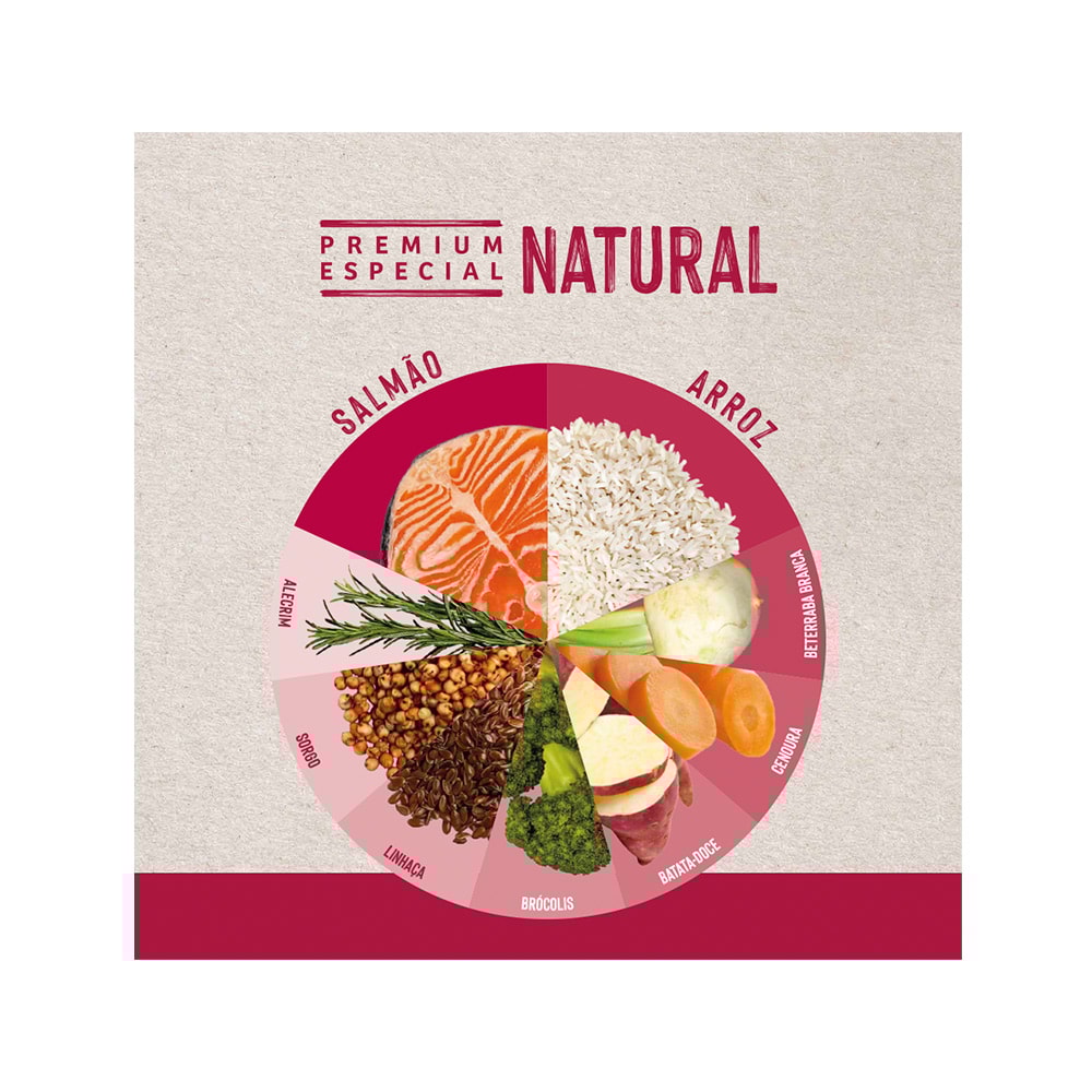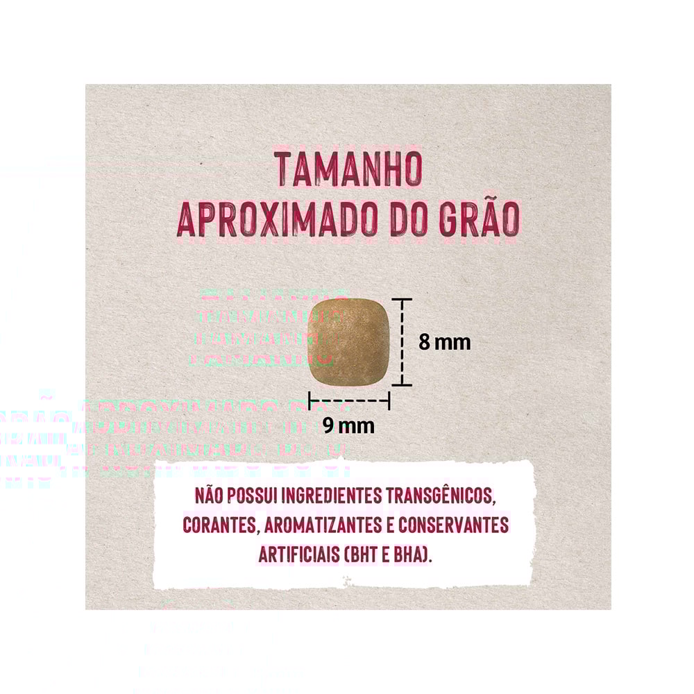 Farinha de vísceras de frango (mín. 28%), farinha de salmão (mín. 1%), farinha de torresmo, arroz quebrado (mín. 20%), sorgo integral moído, gordura de aves, gordura suína, complexo de vegetais (mín. 2,5%) (farinha de batata-doce, polpa desidratada de beterraba, brócolis desidratado, cenoura desidratada), grão de linhaça, levedura de cervejaria inativada desidratada, cloreto de potássio, parede celular de levedura (fonte de beta-glucano 1,3-1,6), hidrolisado de fígado de aves e suíno, mananoligossacarídeo (MOS) (mín. 0,1%), zeólita, lignocelulose, extrato de yucca (mín. 0,03%), extrato de alecrim (mín. 0,001%), tocoferol (concentrado mín. 0,09%), lisina, metionina, ácido fosfórico, taurina, acetato de retinol (vit. A), colecalciferol (vit. D3), ácido ascórbico (vit. C), acetato de DL-alfa-tocoferol (vit. E), mononitrato de tiamina (vit. B1), riboflavina (vit. B2), cloridrato de piridoxina (vit. B6), cianocobalamina (vit. B12), menadiona bissulfito de nicotinamida (vit. K3), biotina, cloreto de colina, niacina (vit. B3), ácido fólico (vit. B9), D-pantotenato de cálcio (vit. B5), sulfato de cobre monohidratado, sulfato de ferro, sulfato de zinco, sulfato de manganês, selenito de sódio, iodato de cálcio, minerais quelatados (proteinato de manganês, proteinato de selênio, proteinato de zinco).