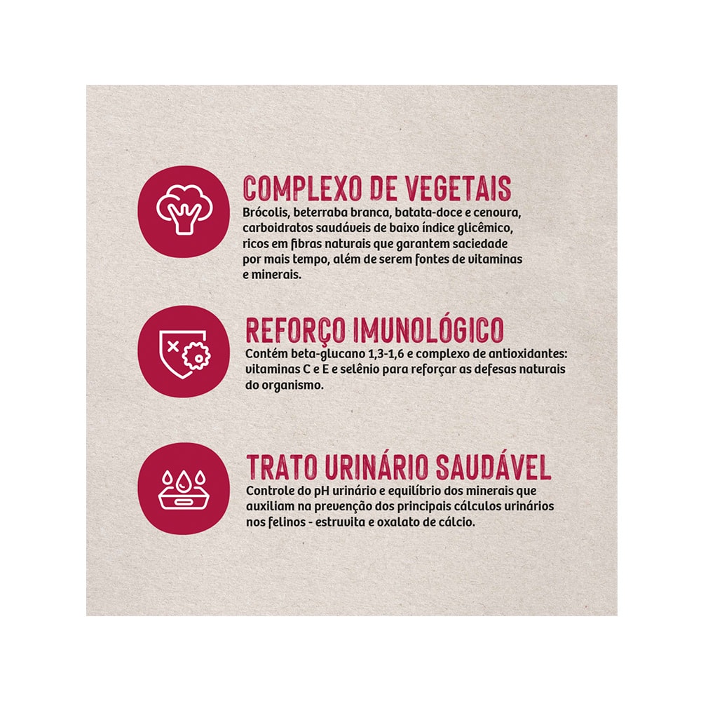 O complexo de vegetais, composto por brócolis, beterraba branca, batata-doce e cenoura, não só oferece carboidratos saudáveis de baixo índice glicêmico e ricos em fibras naturais, garantindo saciedade por mais tempo, mas também é uma fonte de vitaminas e minerais essenciais para a saúde geral do seu gato.